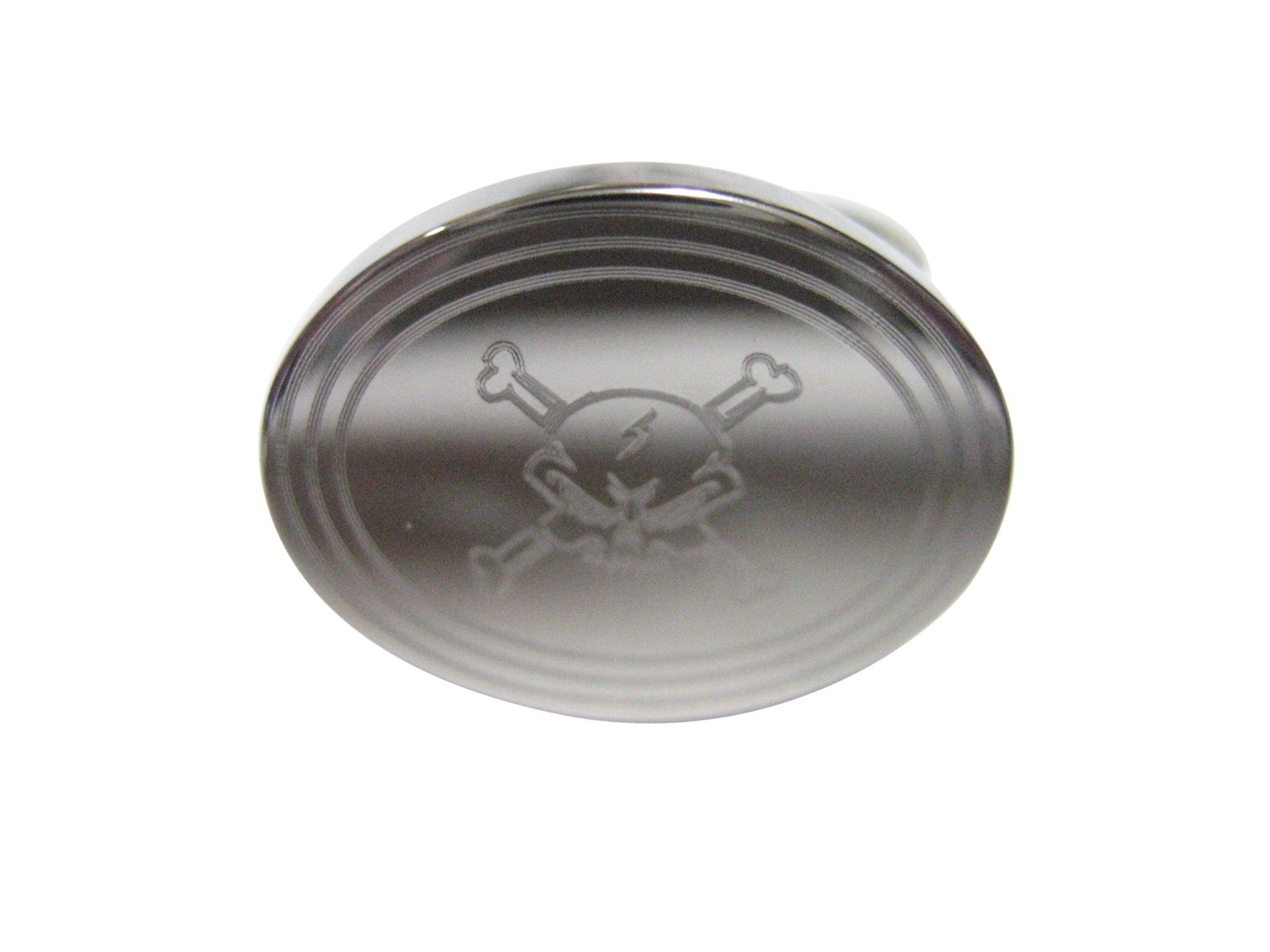 Silver Toned Etched Oval Angry Skull and Crossbones Adjustable Size Fashion Ring