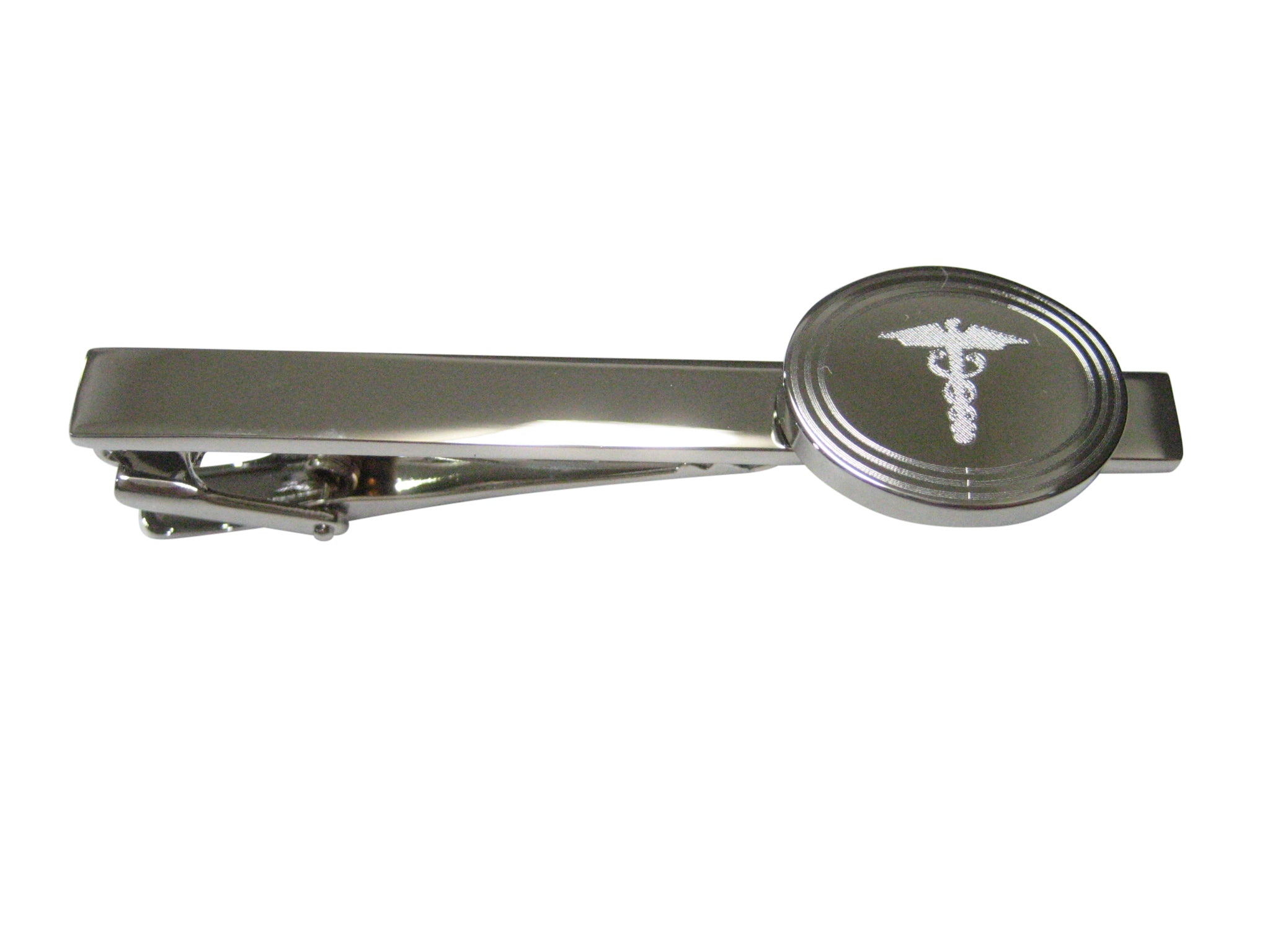 Silver Toned Etched Oval Caduceus Medical Symbol Tie Clip