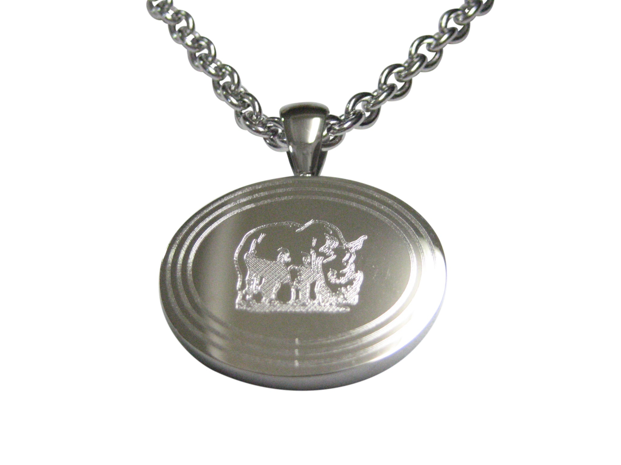 Silver Toned Etched Oval Rhino Pendant Necklace