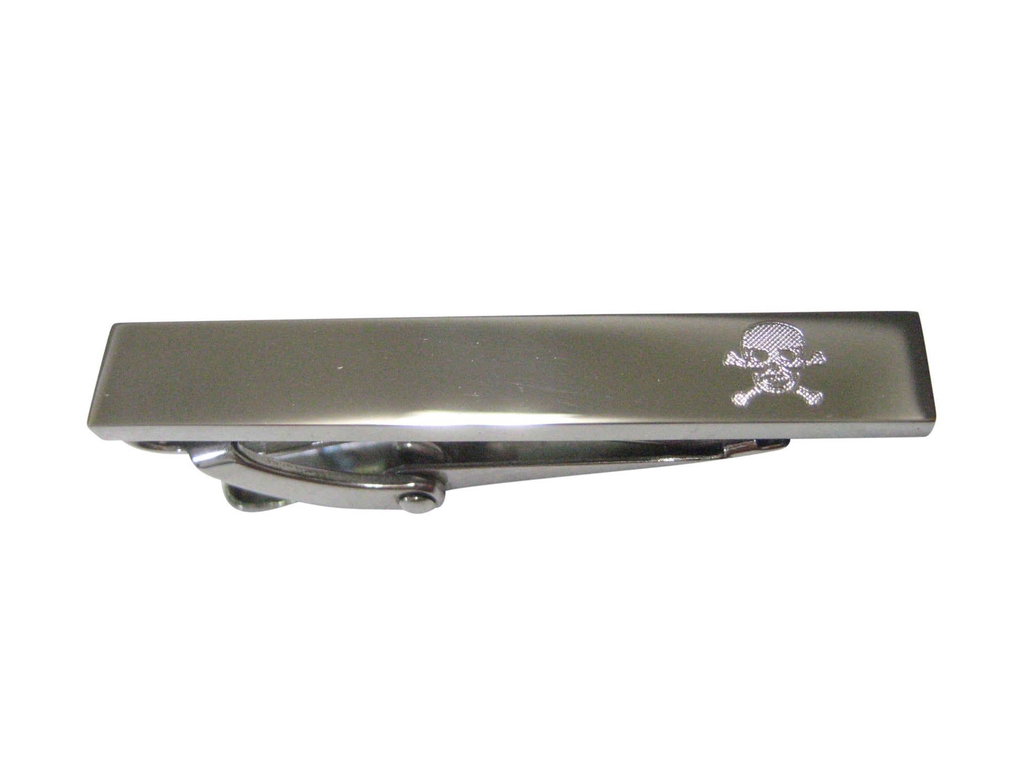 Silver Toned Etched Sleek Skull and Crossbones Skinny Tie Clip