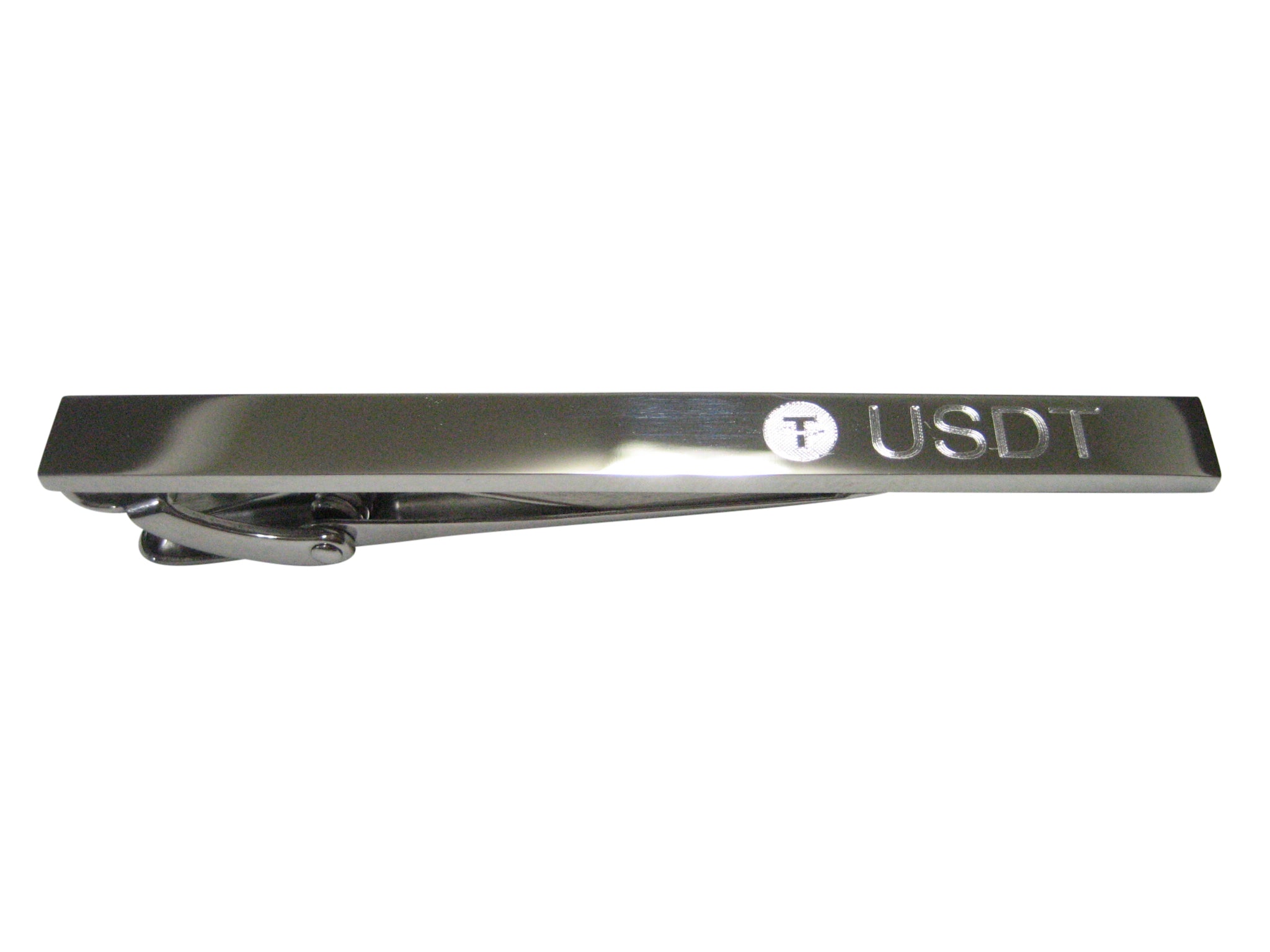 Silver Toned Etched Sleek Tether Coin Cryptocurrency Blockchain Tie Clip