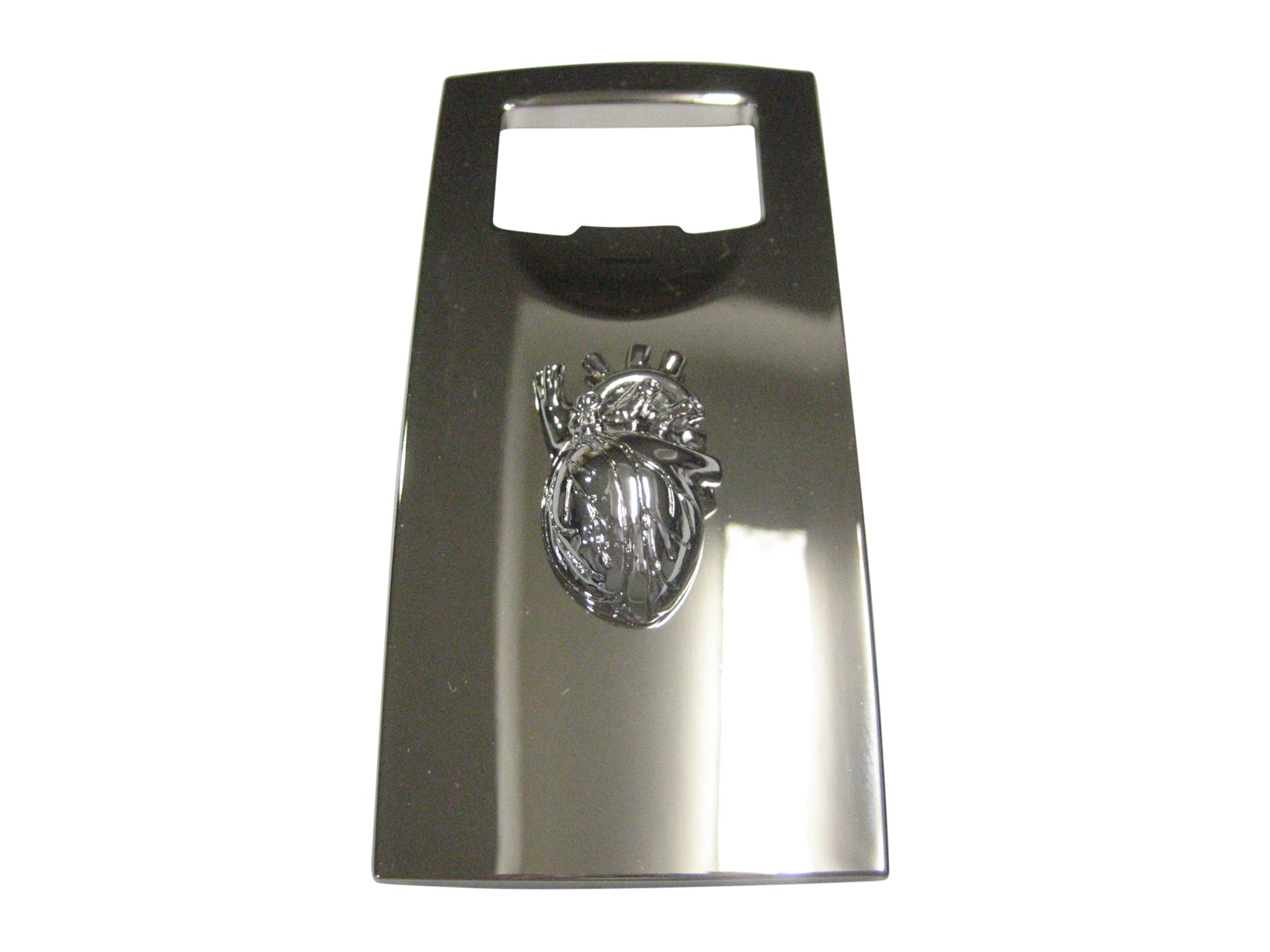 The bottle opener is pretty thick and heavy. It is 3 7/8 inch long by 1 3/4 inch wide