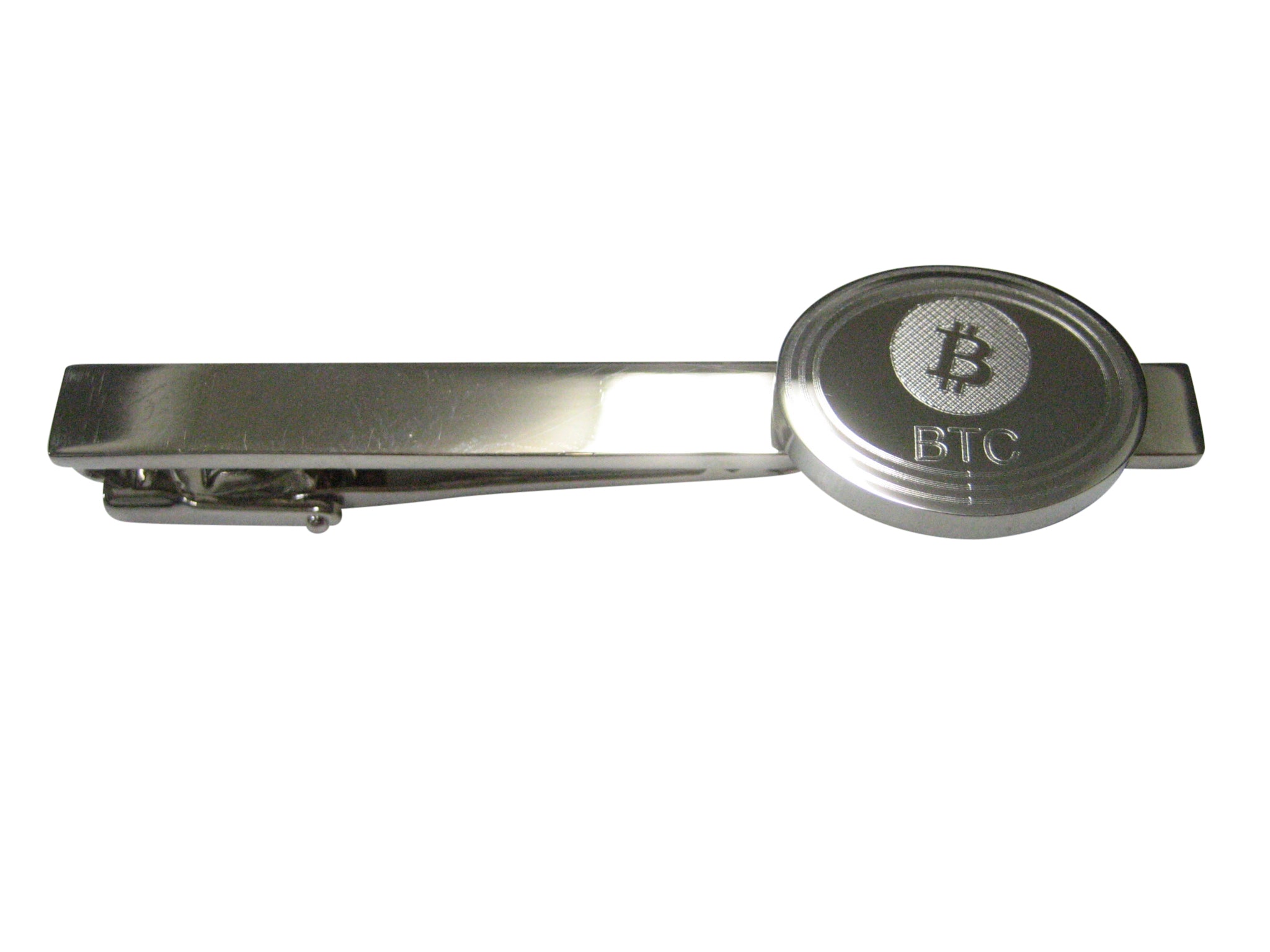 Silver Toned Oval Etched Bitcoin Coin Cryptocurrency Blockchain Tie Clip