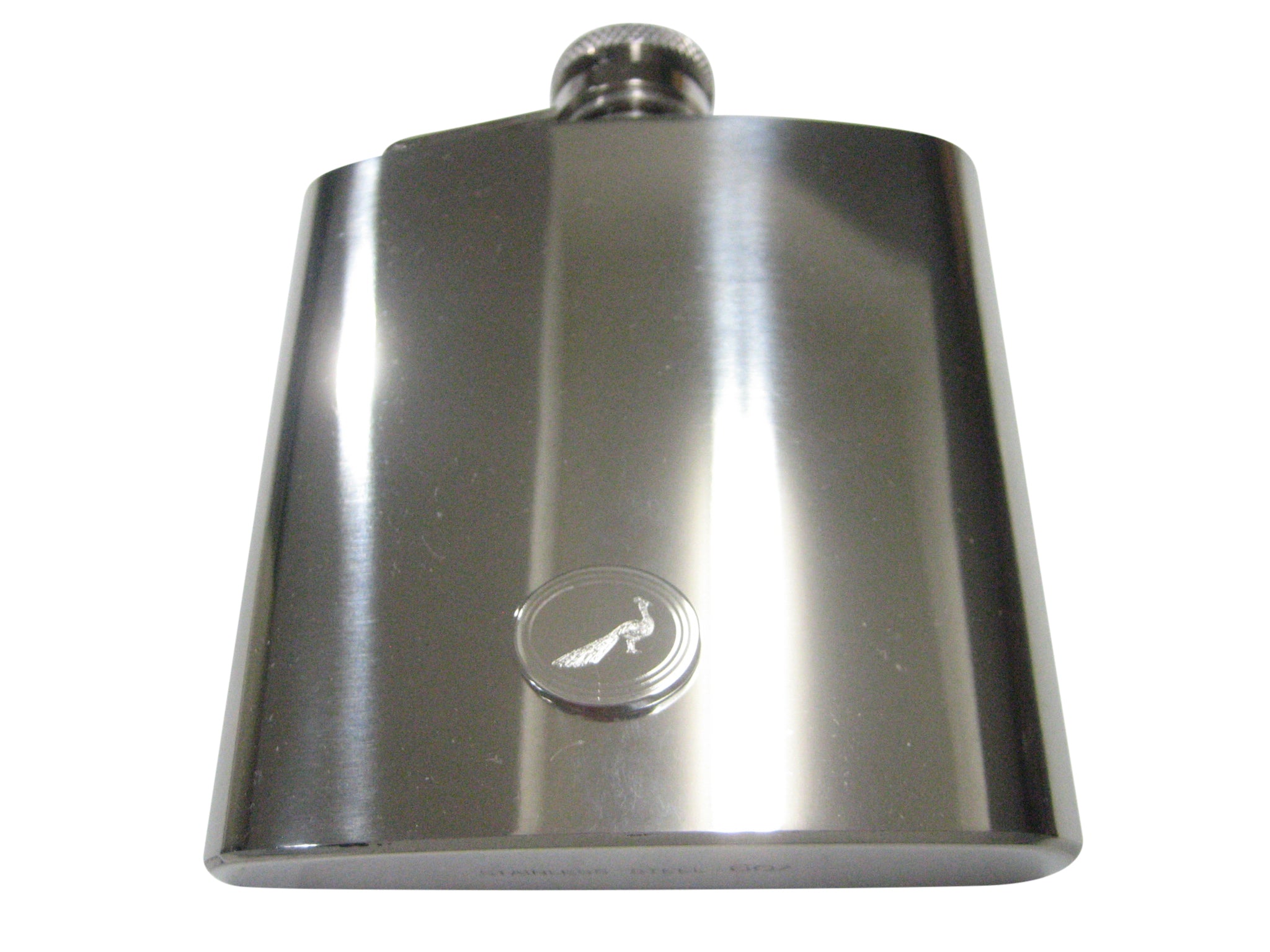 Silver Toned Oval Etched Peacock Bird 6oz Flask