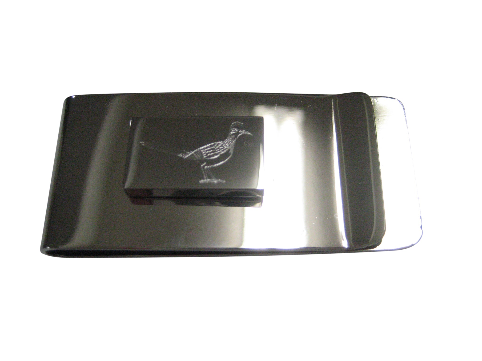 Silver Toned Rectangular Etched Roadrunner Bird Money Clip