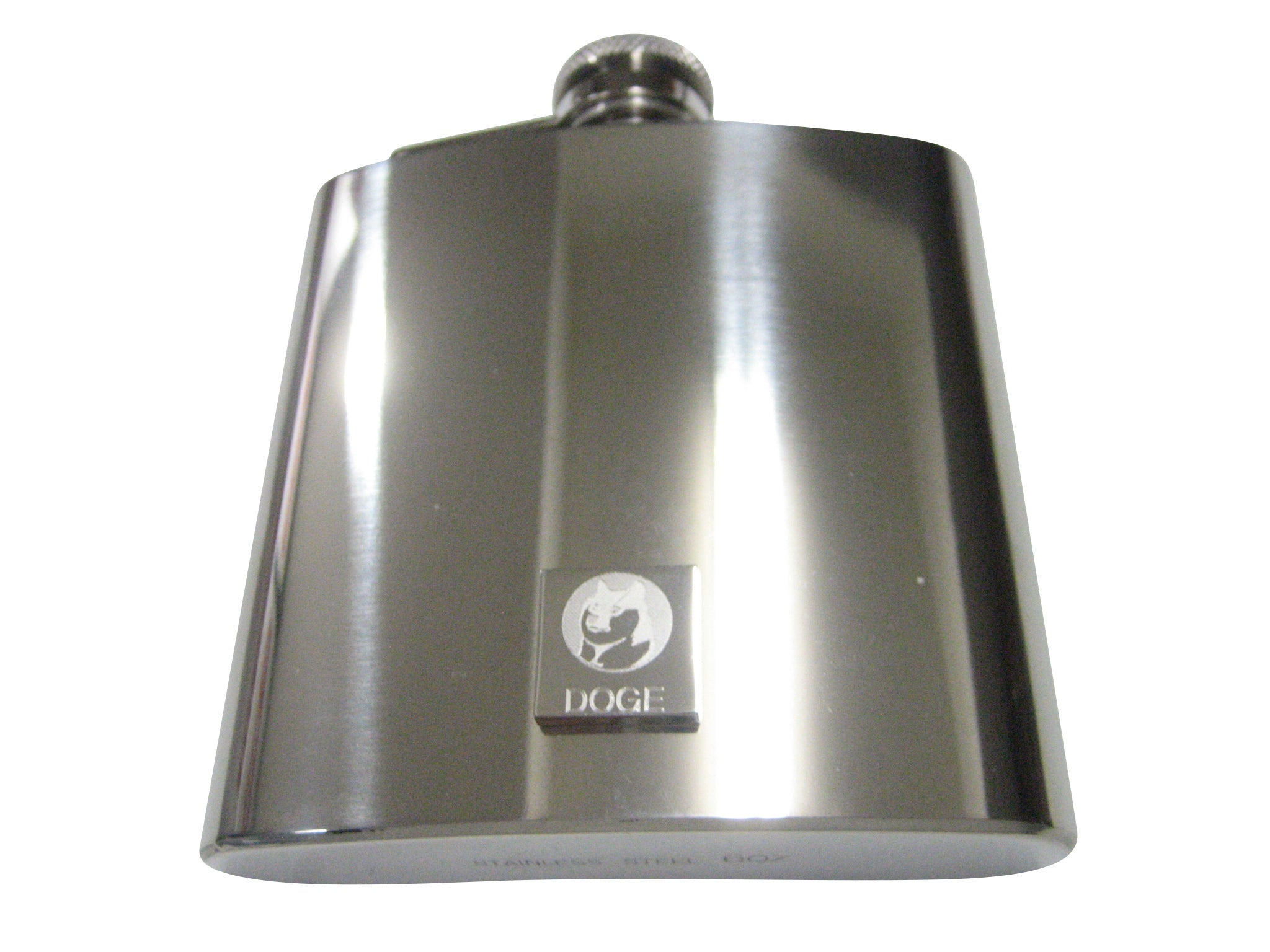 Silver Toned Square Etched Doge Coin Cryptocurrency Blockchain With Shiba Dog 6oz Flask