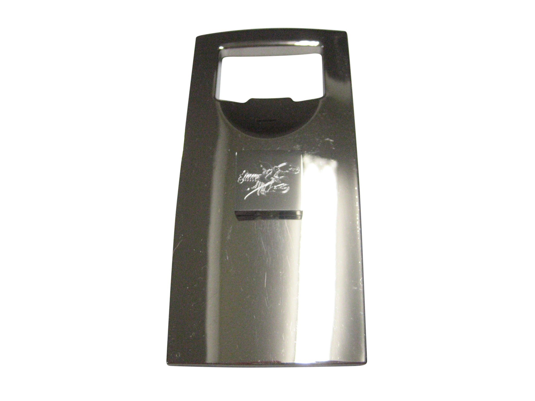 The bottle opener is pretty thick and heavy. It is 3 7/8 inch long by 1 3/4 inch wide