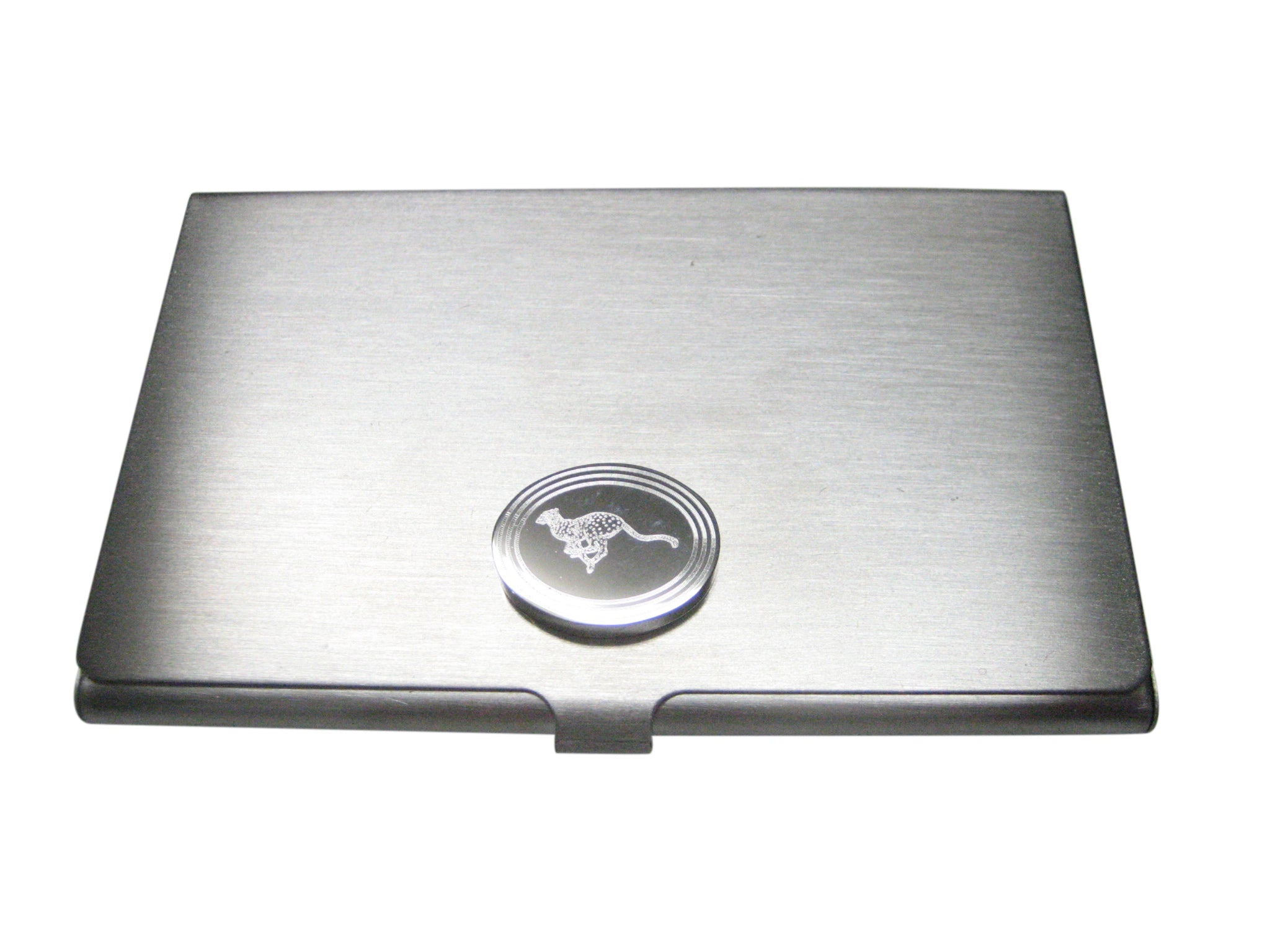 Silver Toned Etched Oval Leaping Cheetah Business Card Holder