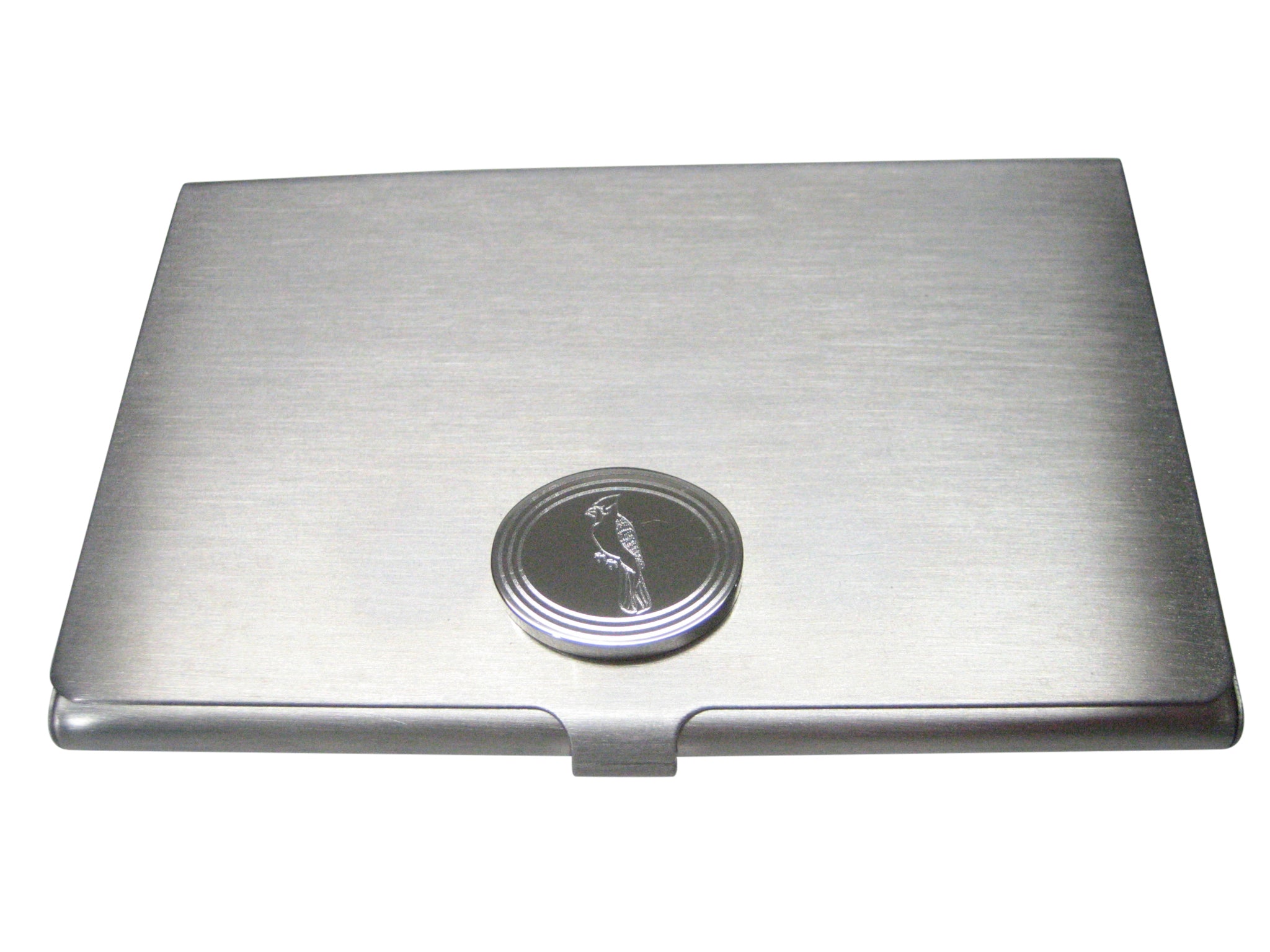 Silver Toned Oval Etched Blue Jay Bird Business Card Holder