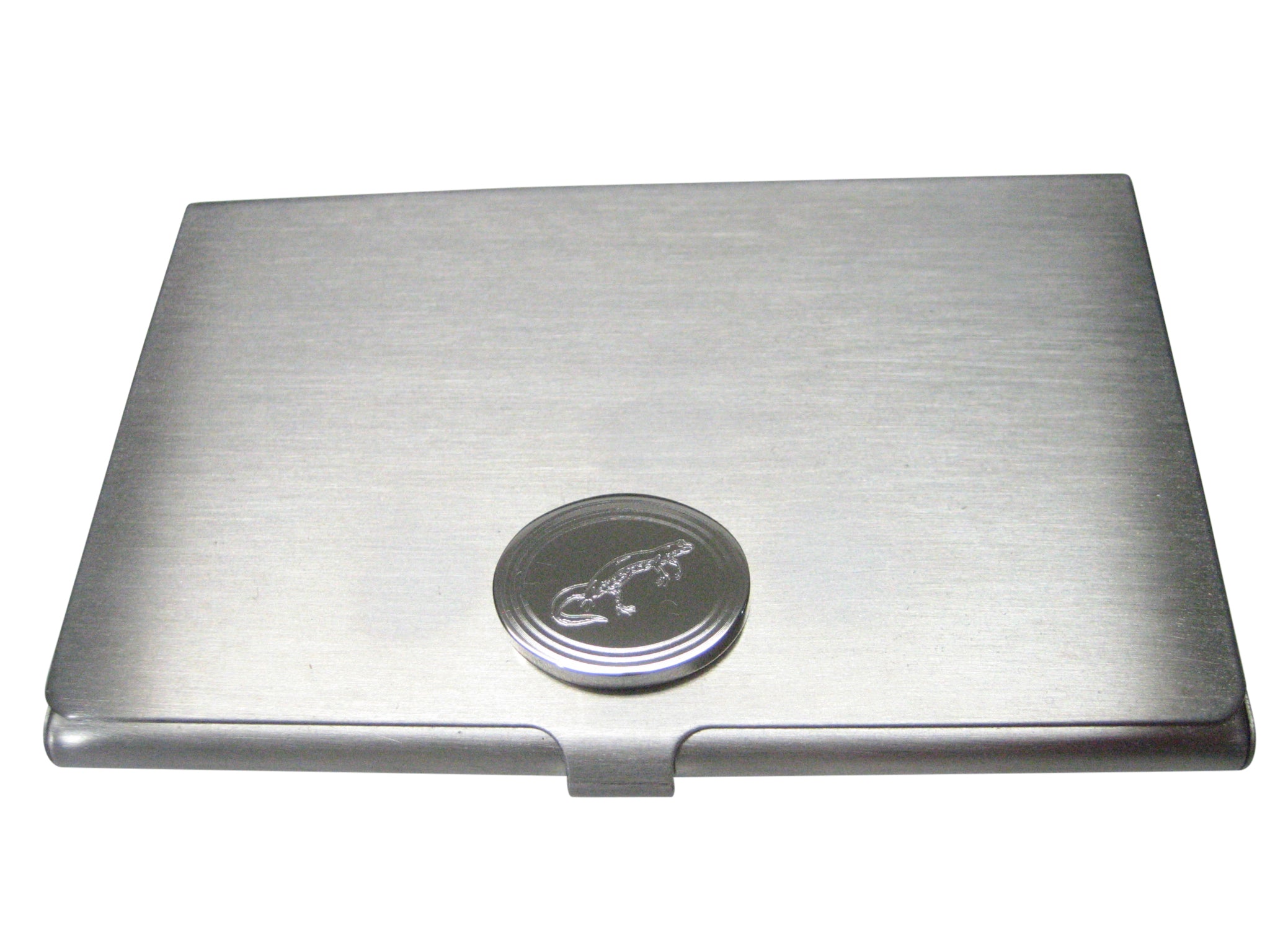 Silver Toned Oval Etched Newt Gecko Lizard Business Card Holder