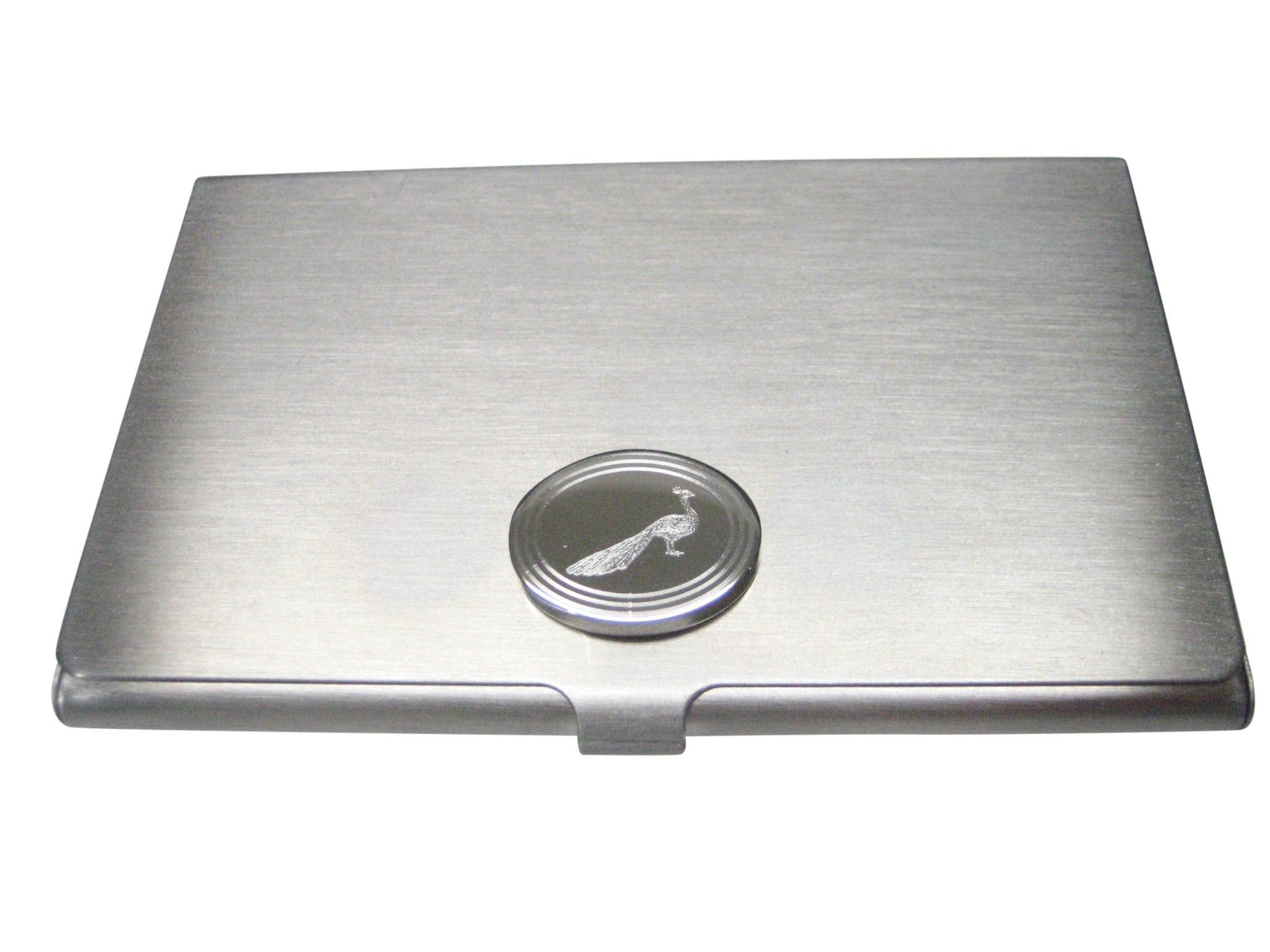 Silver Toned Oval Etched Peacock Bird Business Card Holder