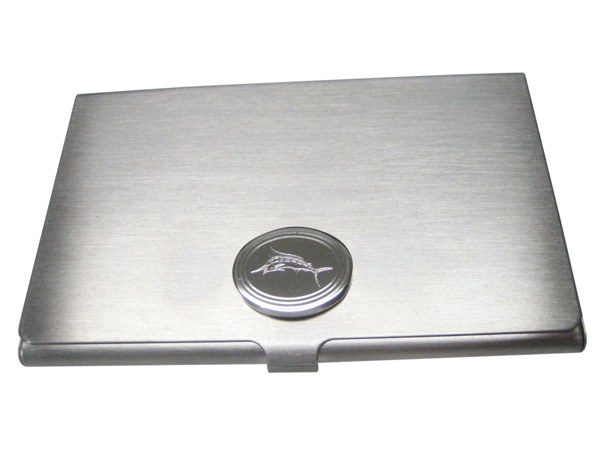 Silver Toned Oval Etched Sailfish Marlin Fish Business Card Holder
