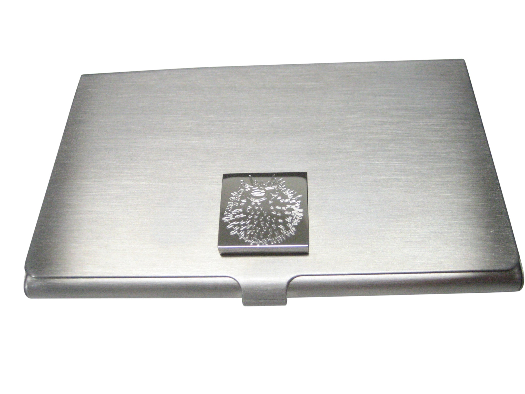 Silver Toned Square Etched Spikey Puffer Fish Fugu Blowfish Business Card Holder