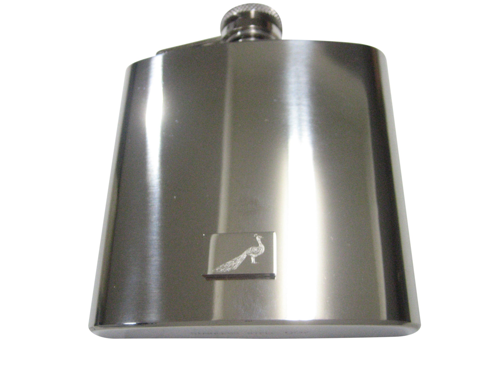 Silver Toned Rectangular Etched Peacock Bird 6oz Flask