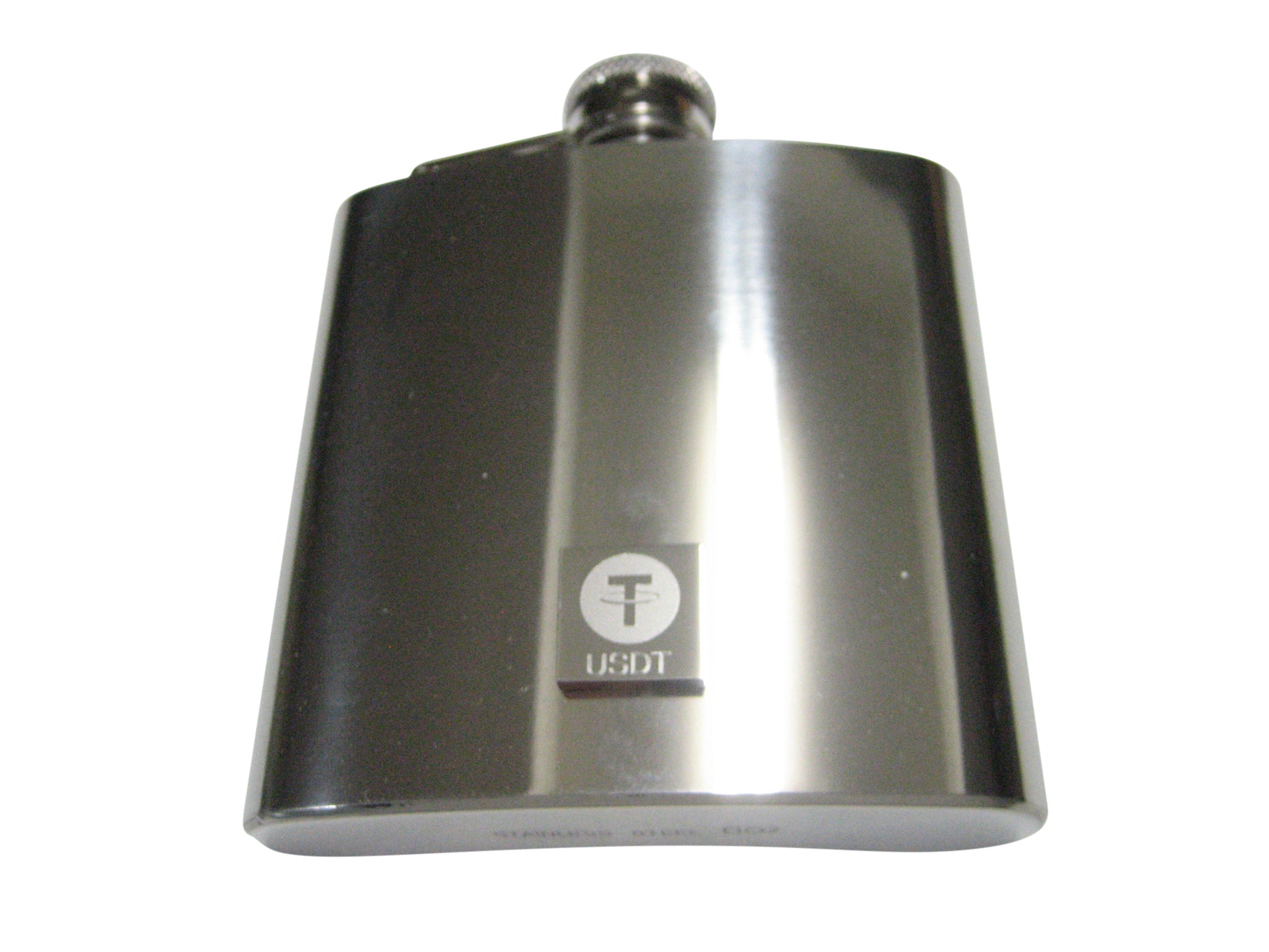 Silver Toned Square Etched Tether Stable Coin USDT Cryptocurrency Blockchain 6oz Flask