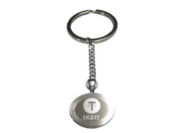 Silver Toned Oval Etched Tether Coin Cryptocurrency Blockchain Pendant Keychain