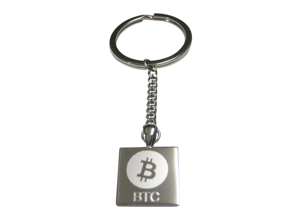 Silver Toned Square Etched Bitcoin Coin Cryptocurrency Blockchain Pendant Keychain