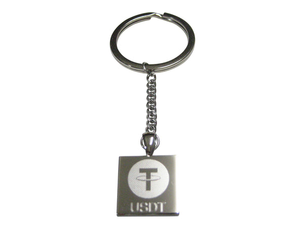 Silver Toned Square Etched Tether Coin Cryptocurrency Blockchain Pendant Keychain