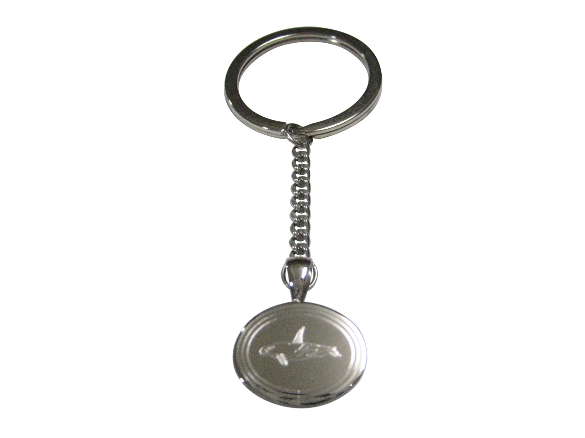 Silver Toned Etched Oval Killer Whale Orca Pendant Keychain