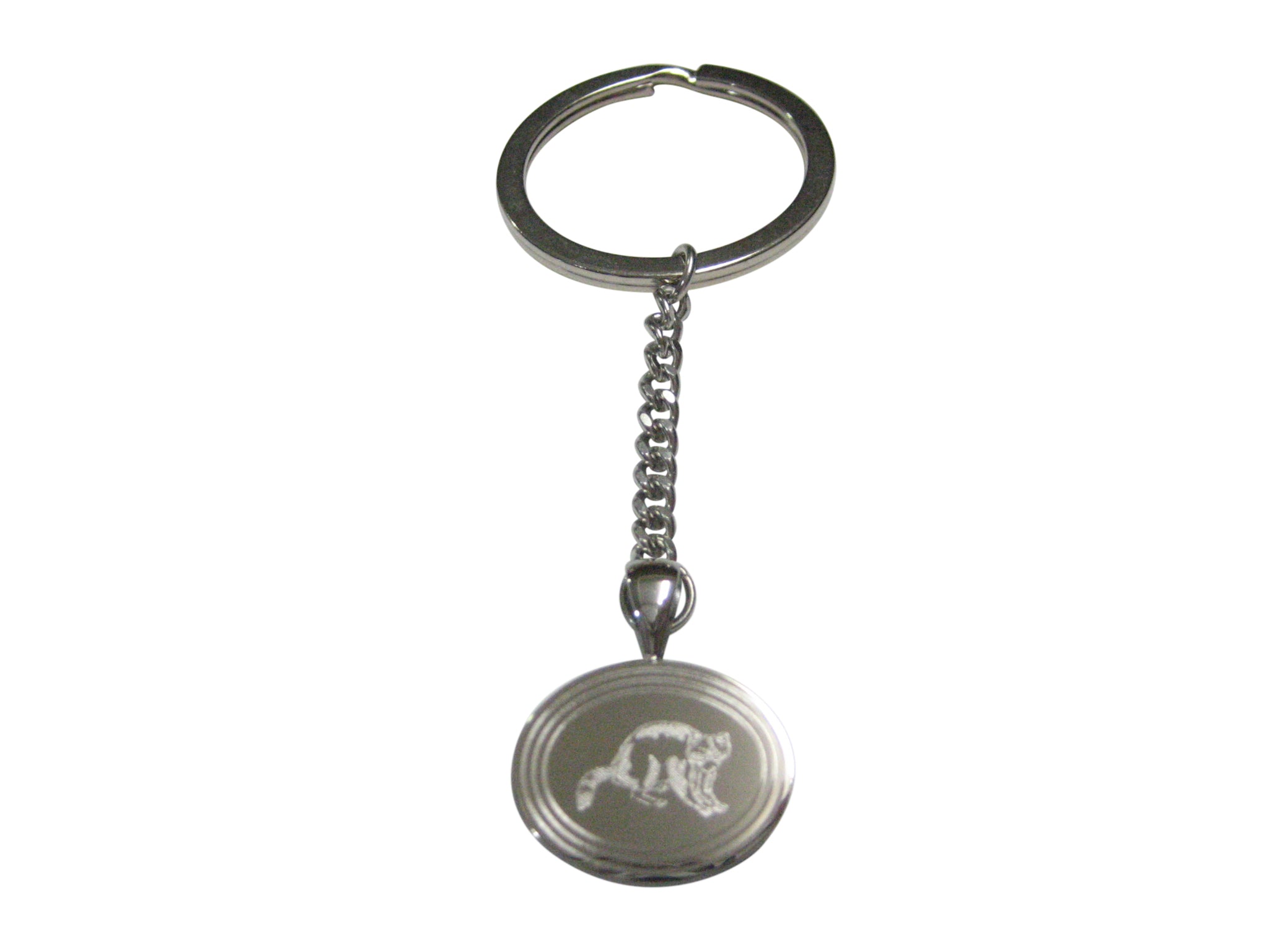 Silver Toned Etched Oval Raccoon Pendant Keychain