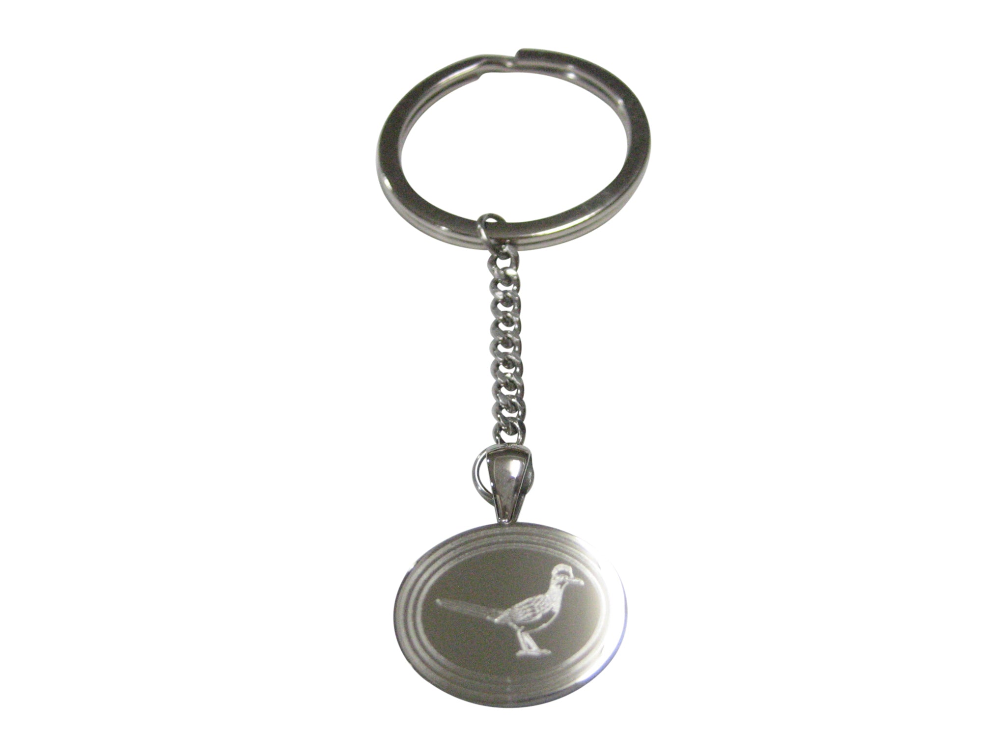 Silver Toned Oval Etched Roadrunner Bird Pendant Keychain