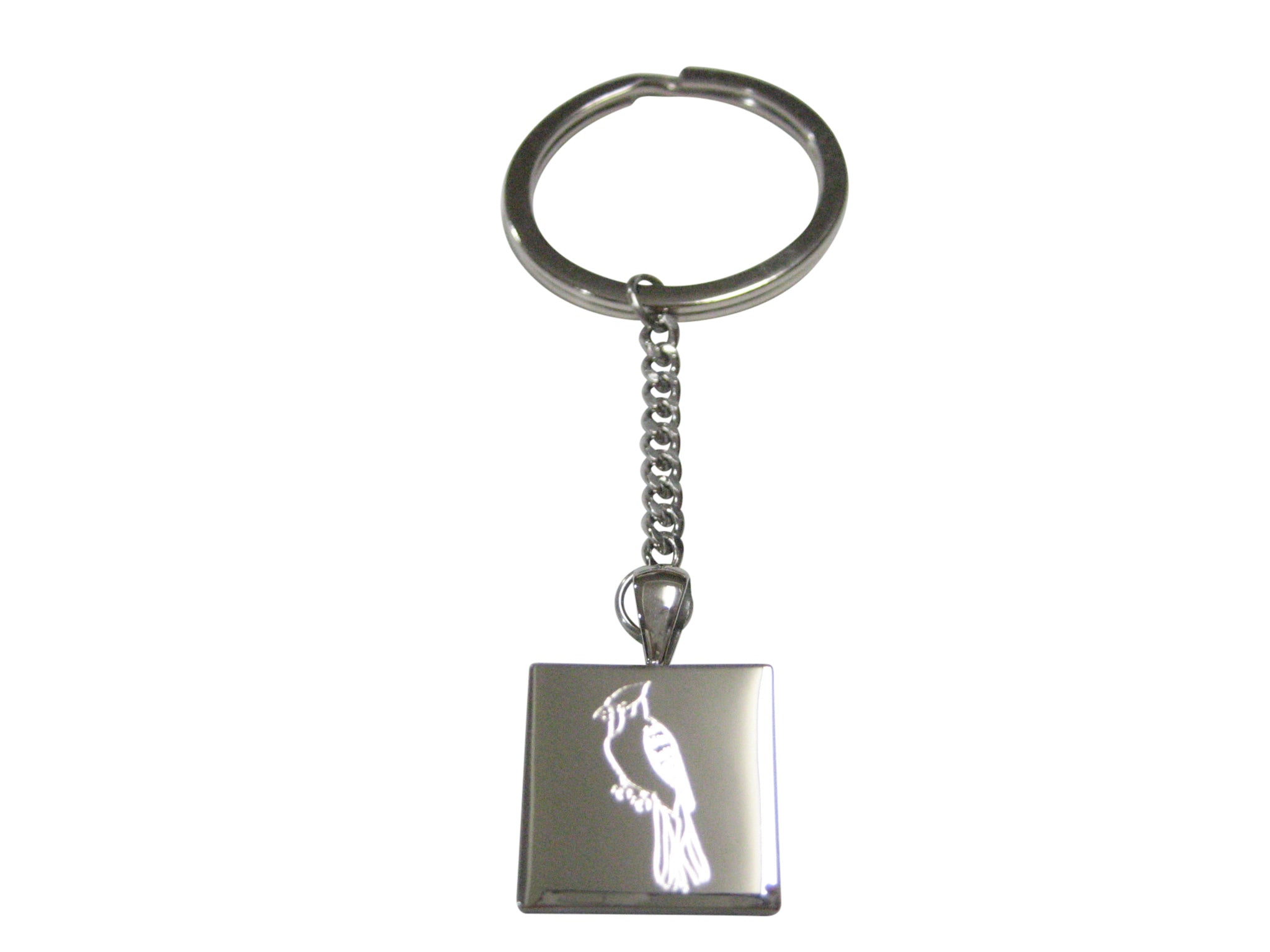 Silver Toned Square Etched Blue Jay Bird Pendant Keychain