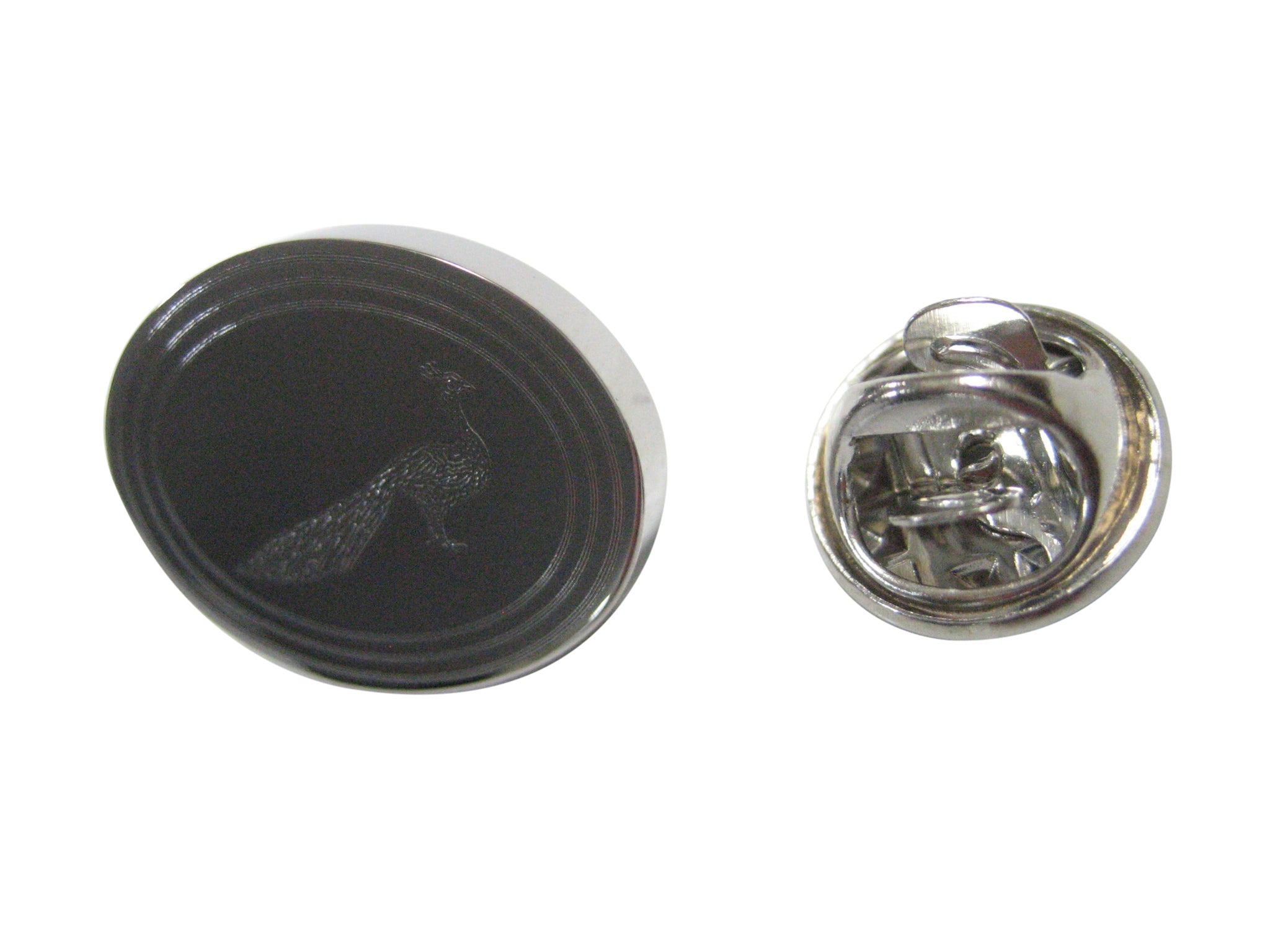 Silver Toned Oval Etched Peacock Bird Lapel Pin