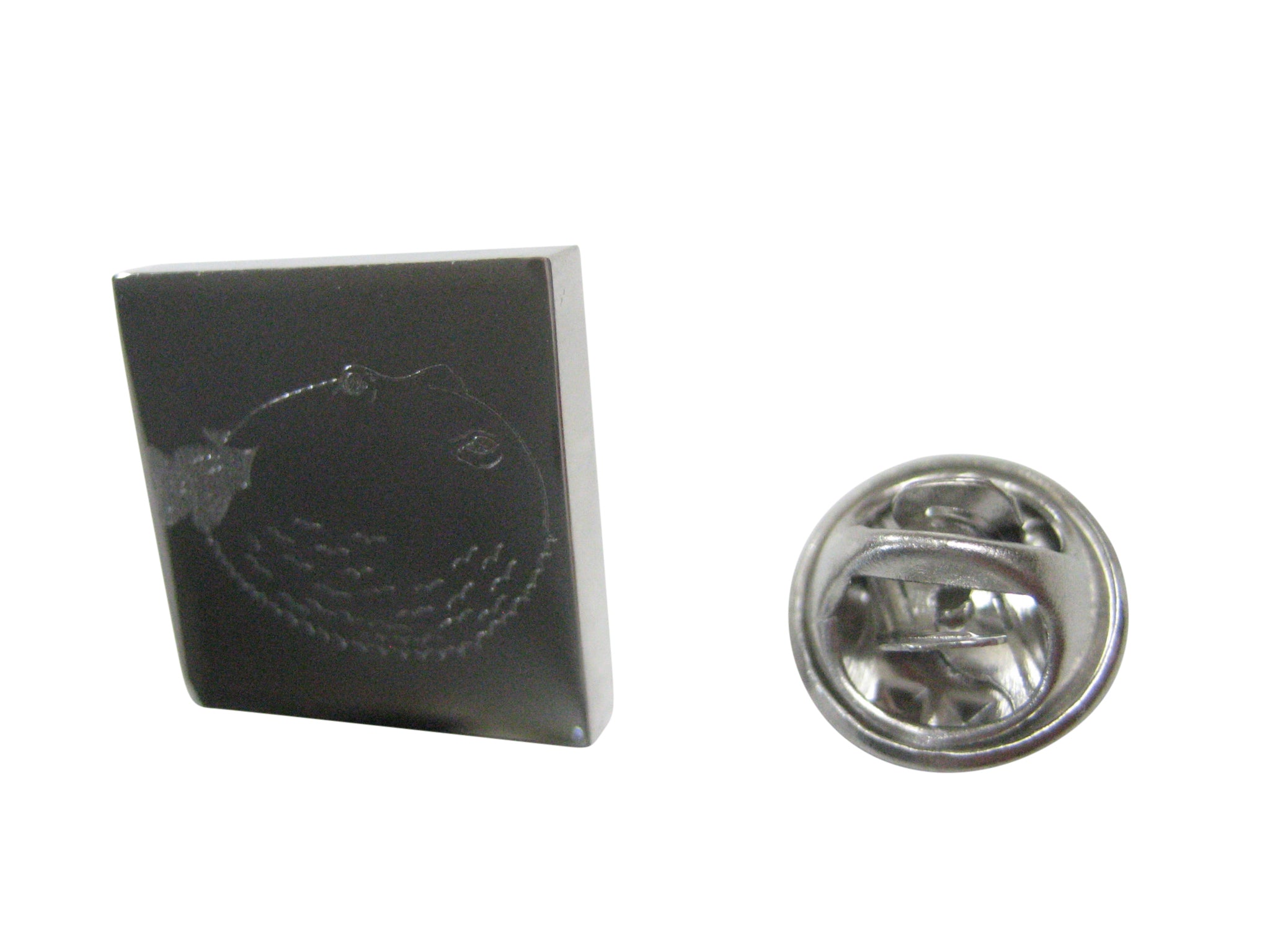 Silver Toned Square Etched Blowfish Fugu Puffer Fish Lapel Pin