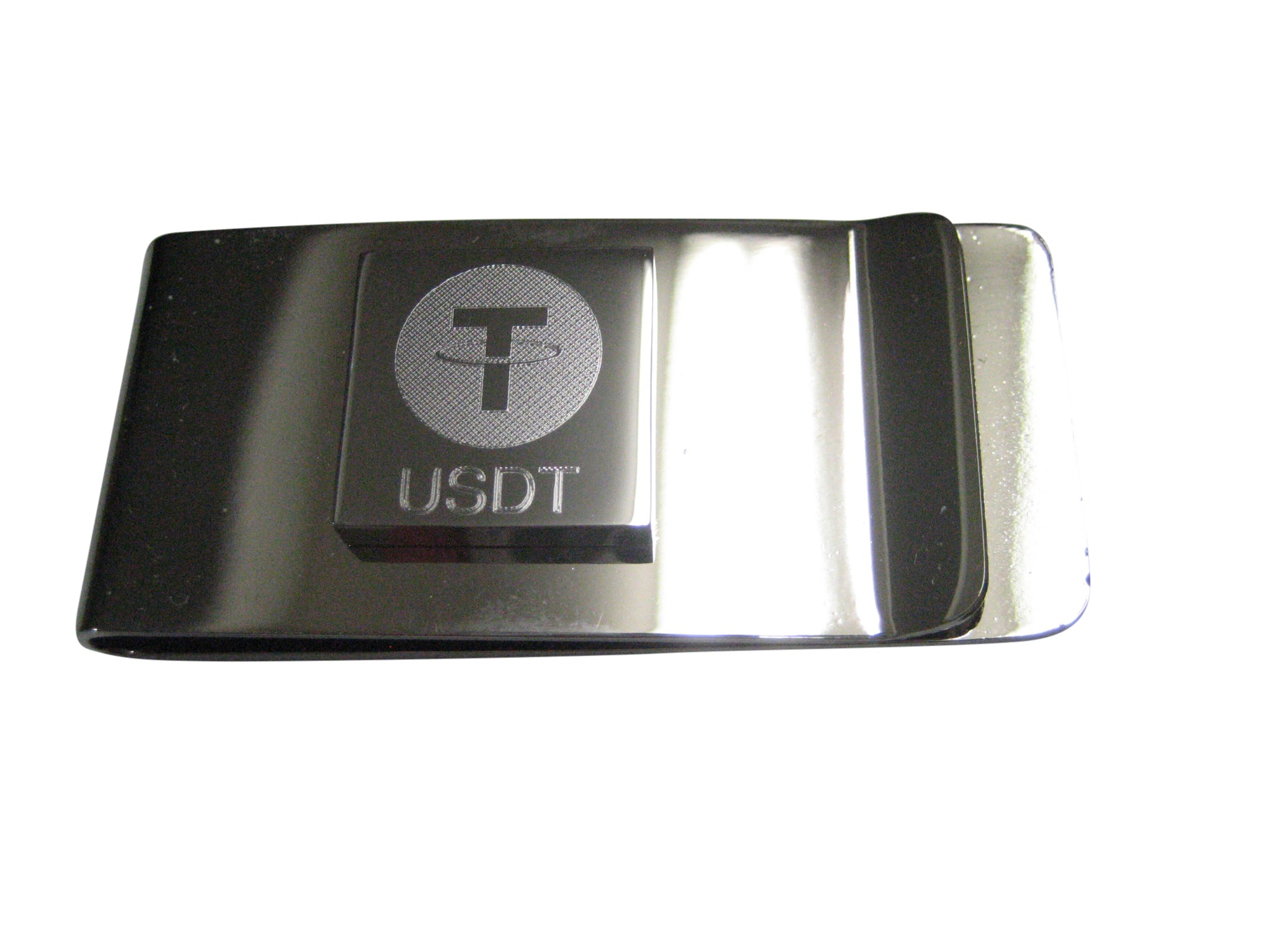 Silver Toned Square Etched Tether Stable Coin USDT Cryptocurrency Blockchain Money Clip