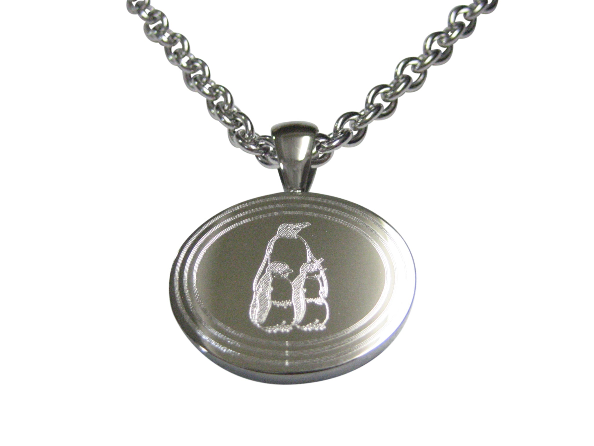 Silver Toned Etched Oval Family of Penguin Birds Pendant Necklace