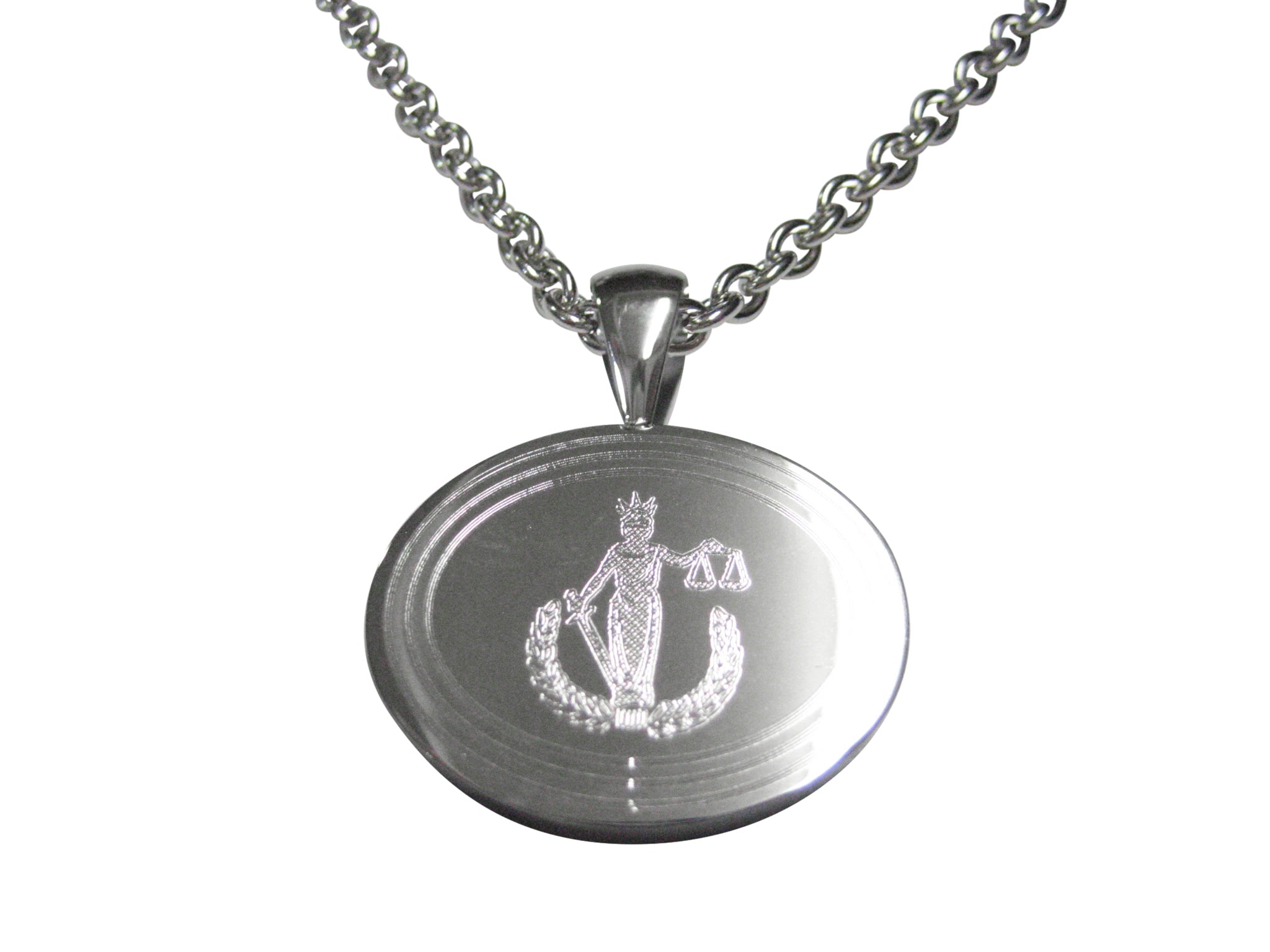 Silver Toned Etched Oval Lady Justice Pendant Necklace