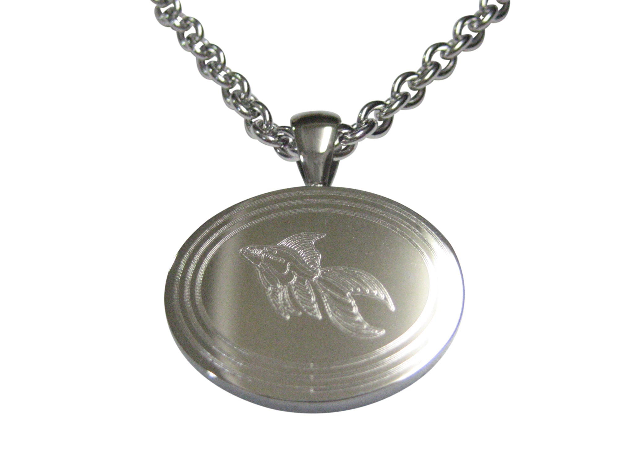 Silver Toned Etched Oval Large Tropical Fish Pendant Necklace