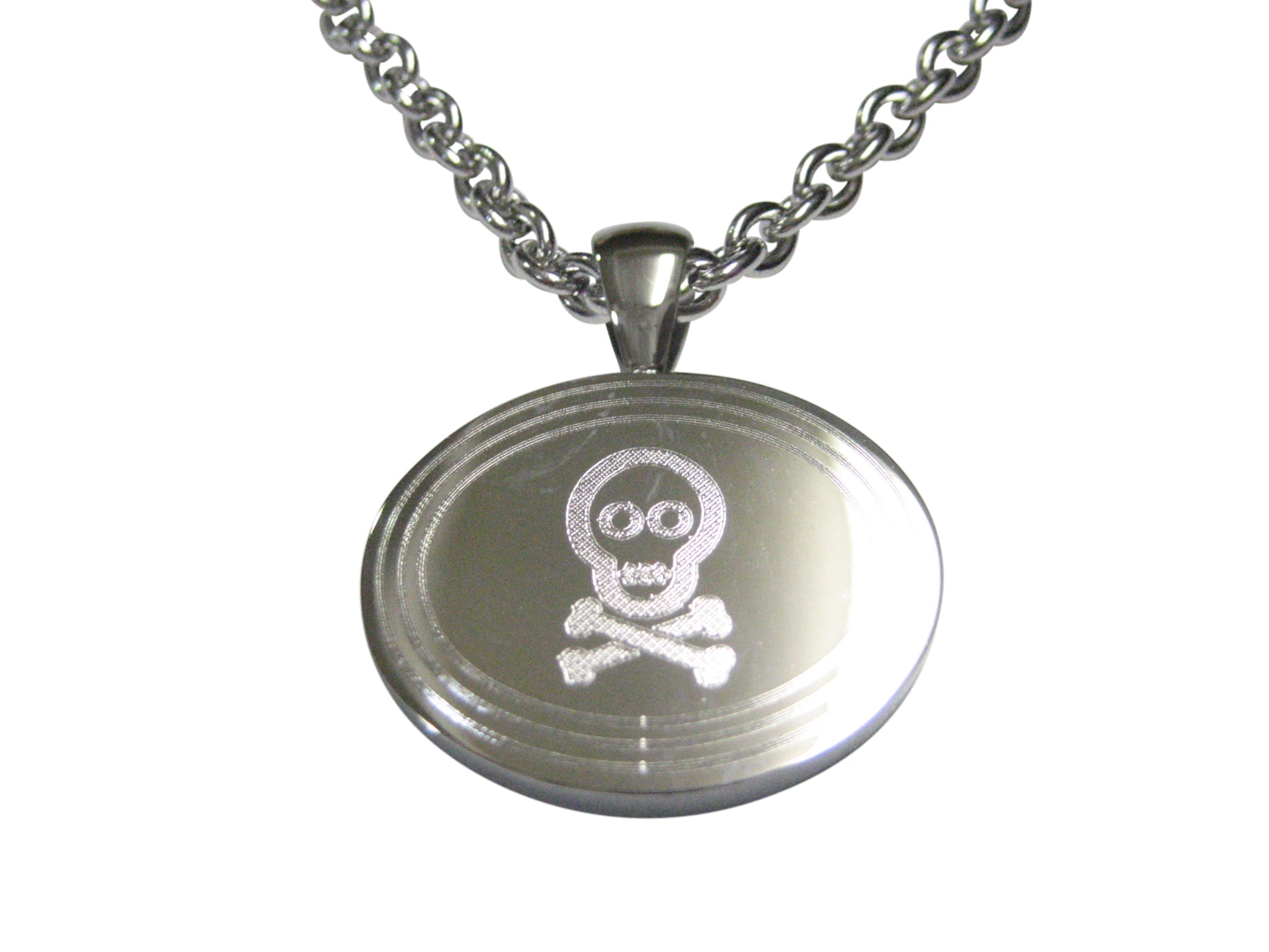 Silver Toned Etched Oval Shy Skull with Crossbones Pendant Necklace