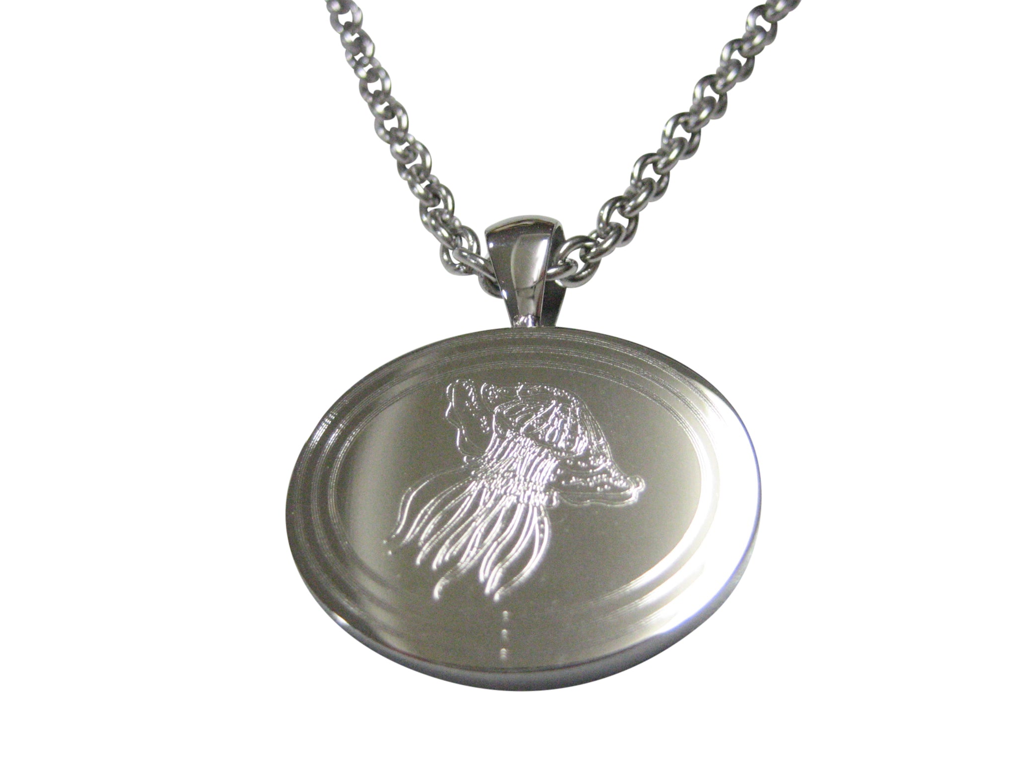 Silver Toned Oval Etched Jellyfish Pendant Necklace