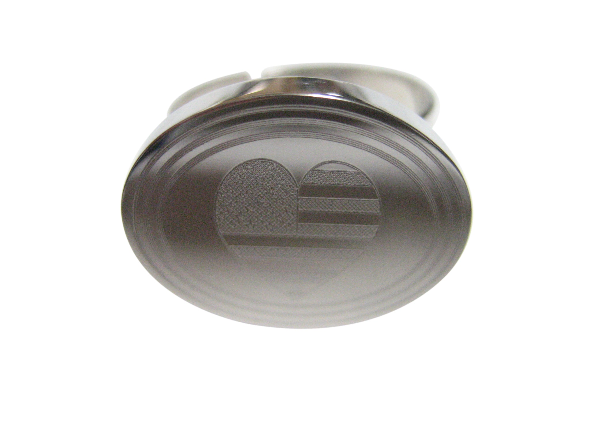 Silver Toned Etched Oval American Flag with Heart Adjustable Size Fashion Ring