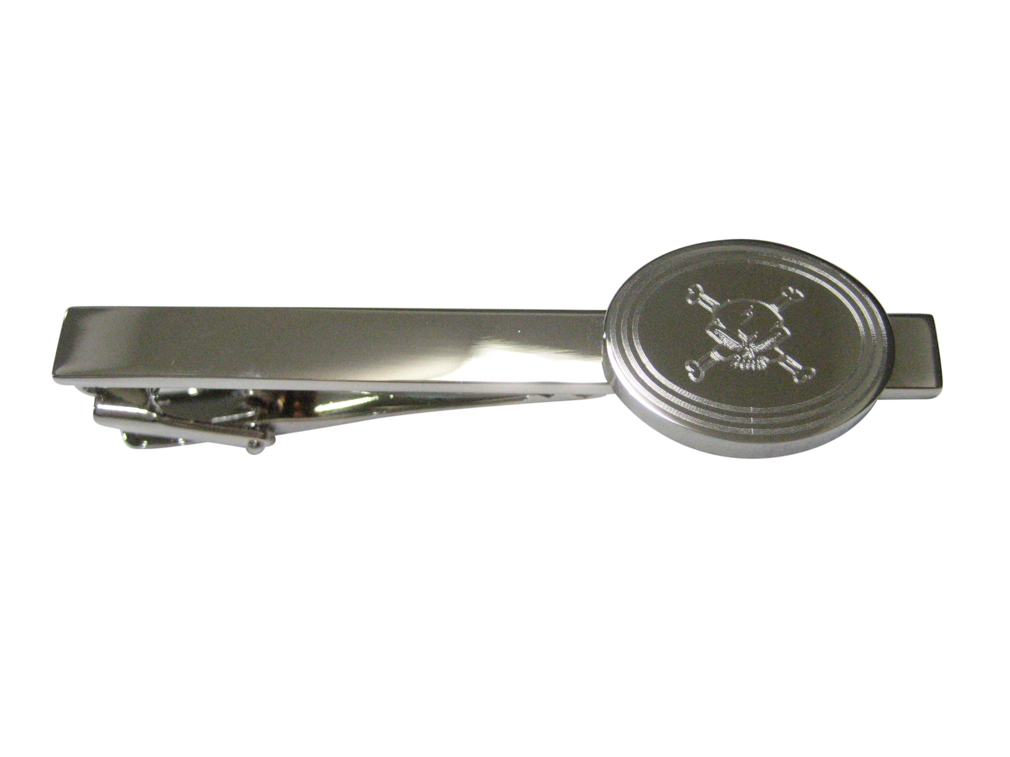 Silver Toned Etched Oval Angry Skull and Crossbones Tie Clip