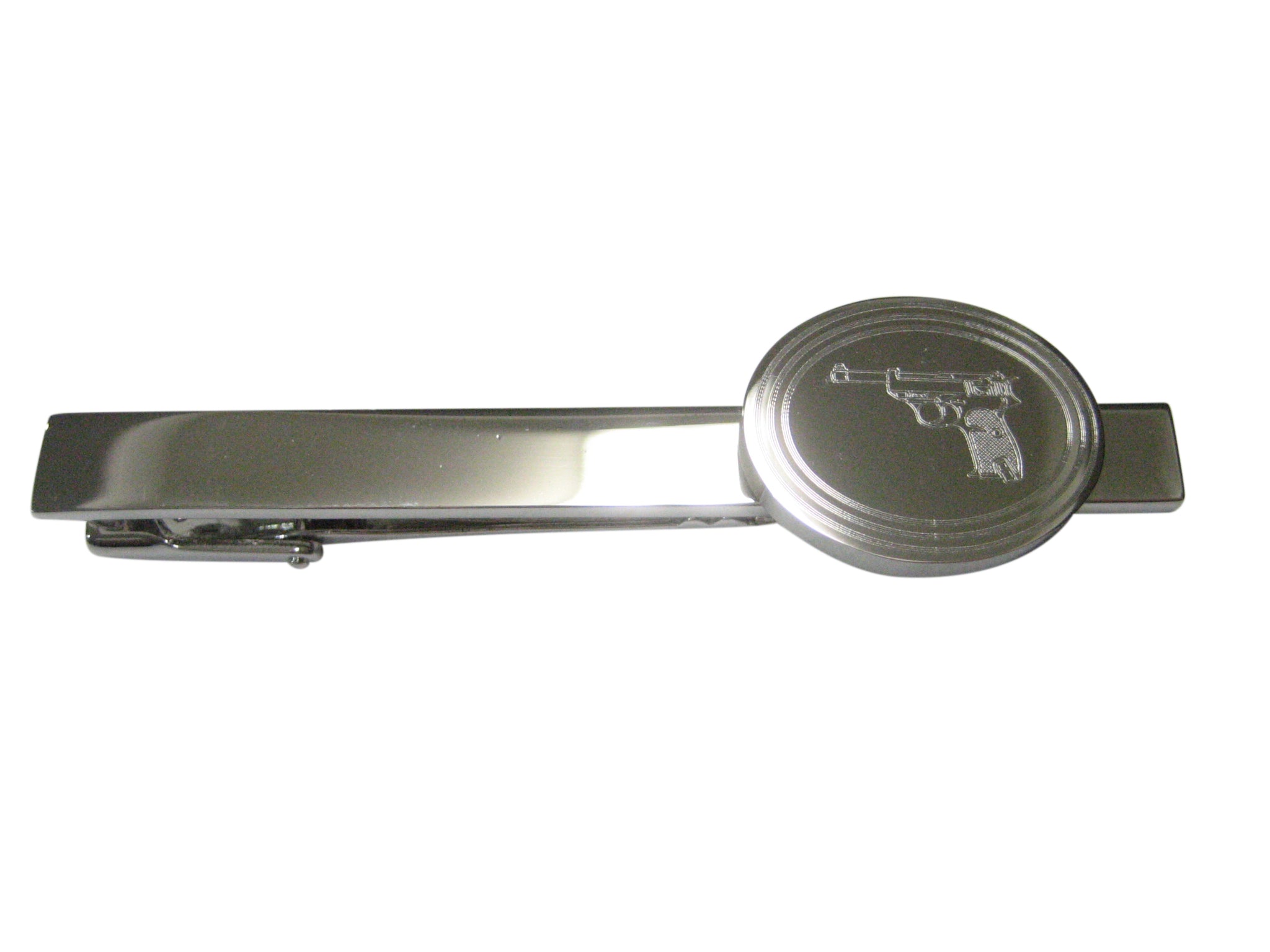 Silver Toned Etched Oval Retro Handgun Tie Clip