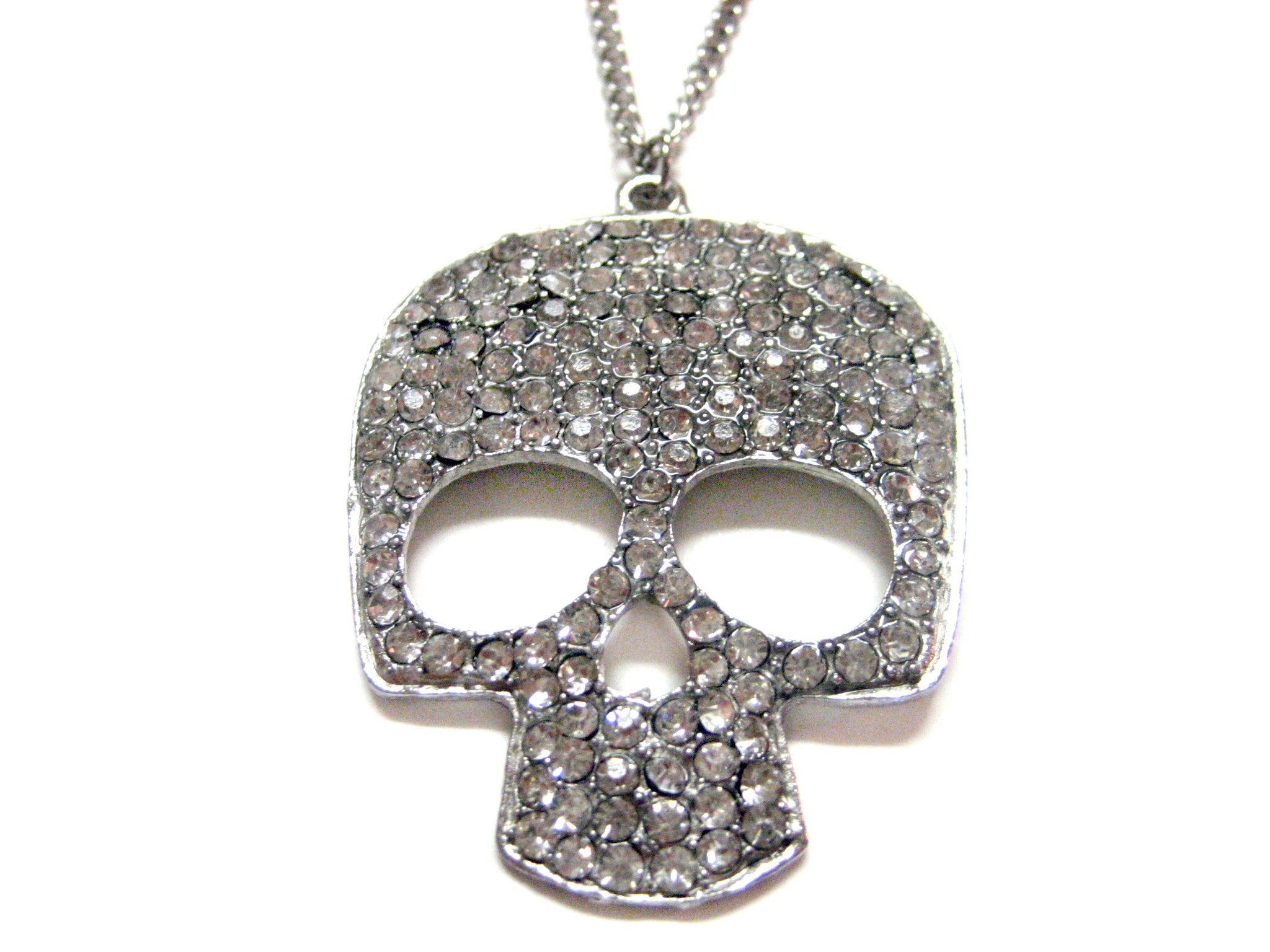 Large Crystallized Silver Toned Skull Pendant Necklace