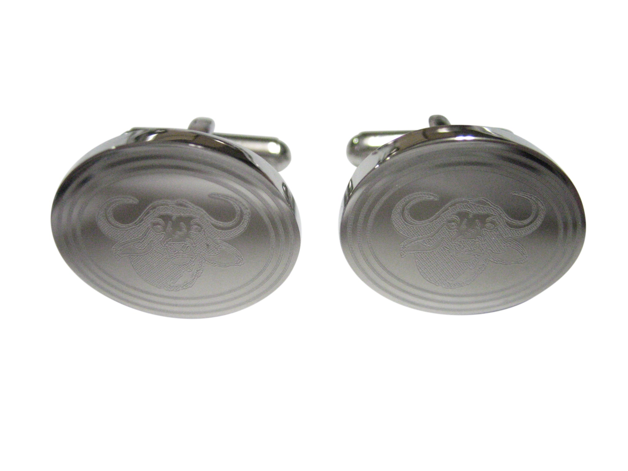 Silver Toned Etched Oval African Buffalo Head Cufflinks