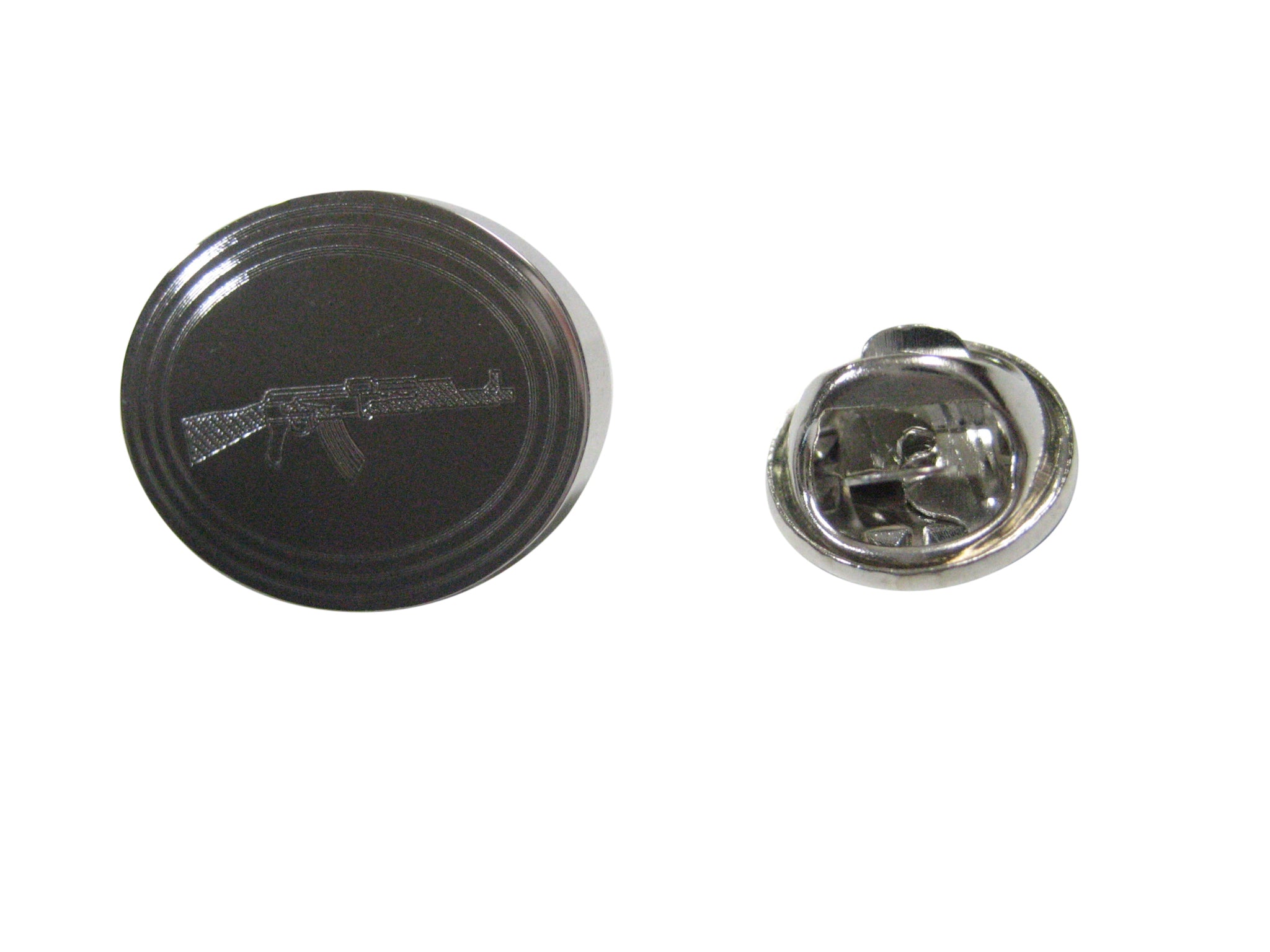 Silver Toned Etched Oval AK47 Rifle Lapel Pin