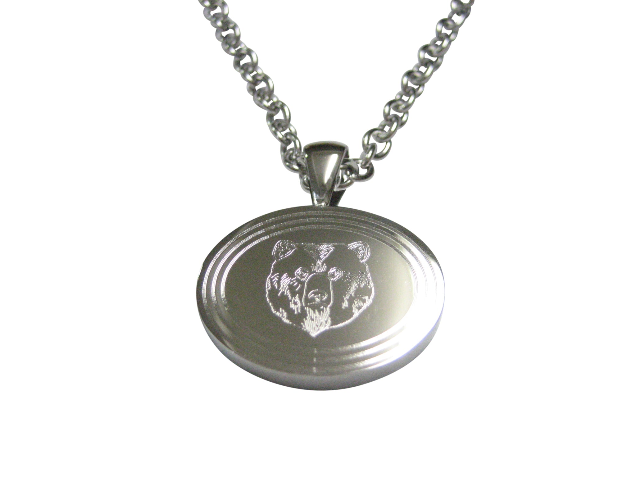 Silver Toned Etched Oval Bear Head Pendant Necklace