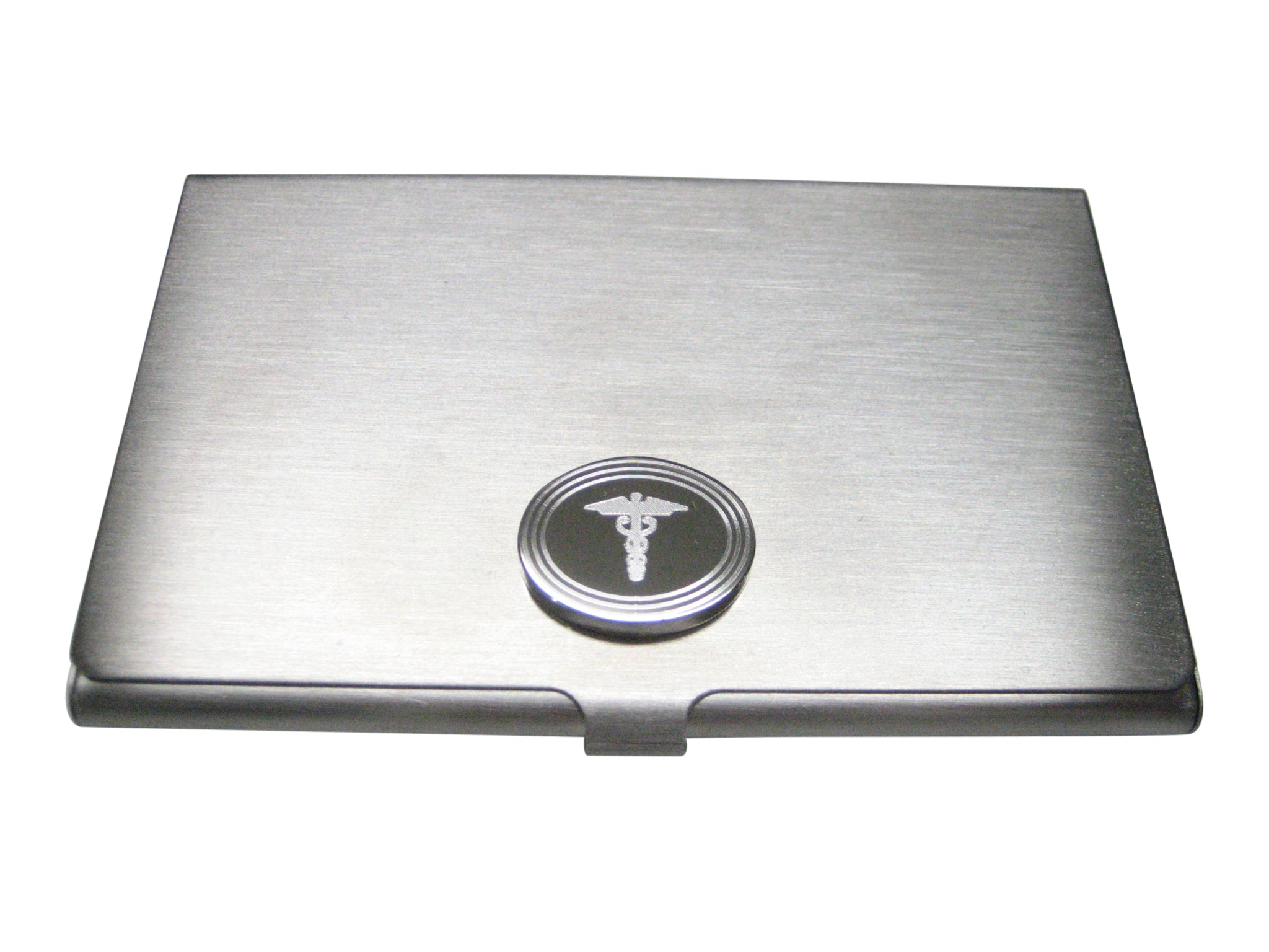 Silver Toned Etched Oval Caduceus Medical Symbol Business Card Holder
