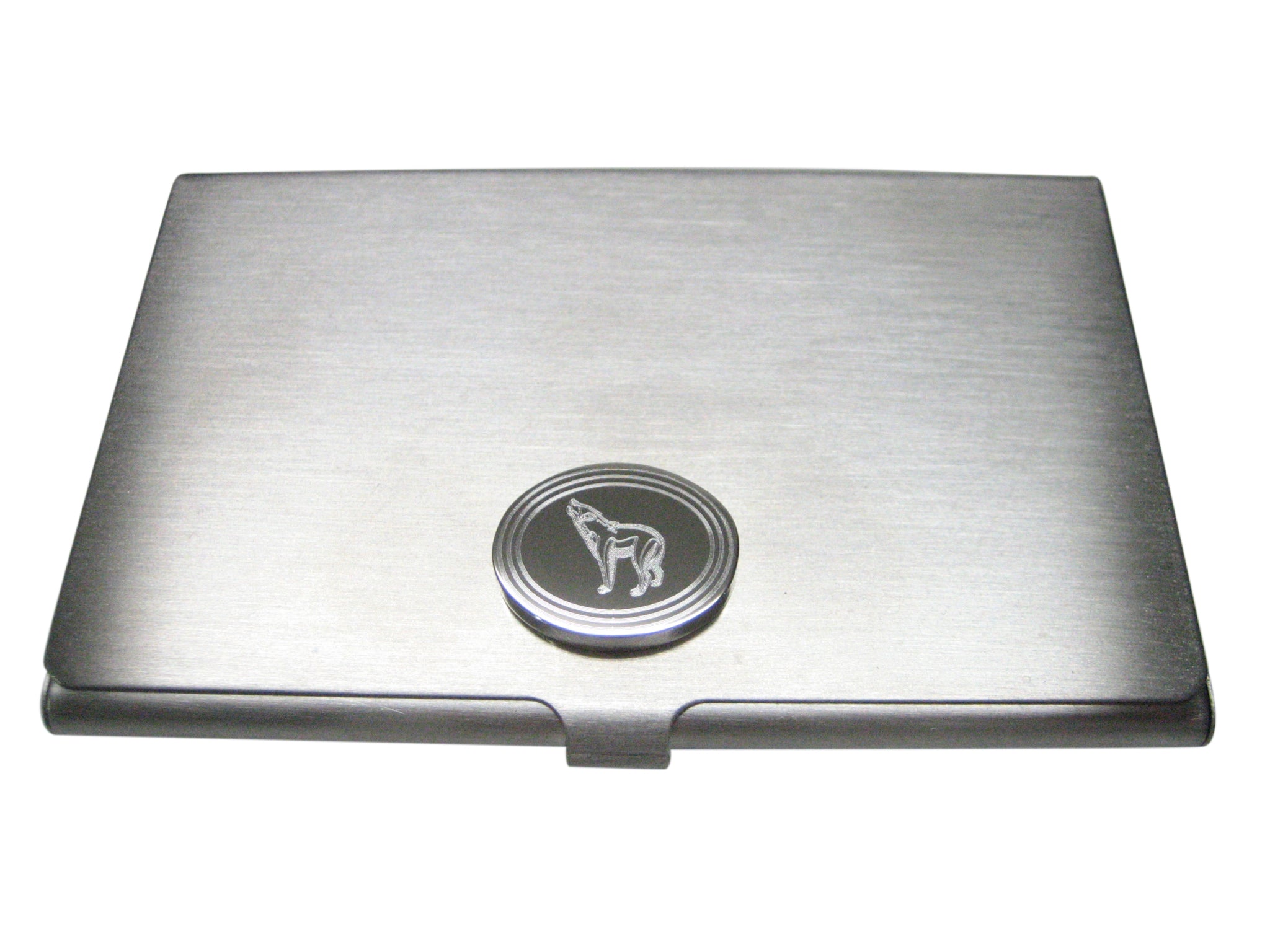 Silver Toned Etched Oval Howling Wolf Business Card Holder