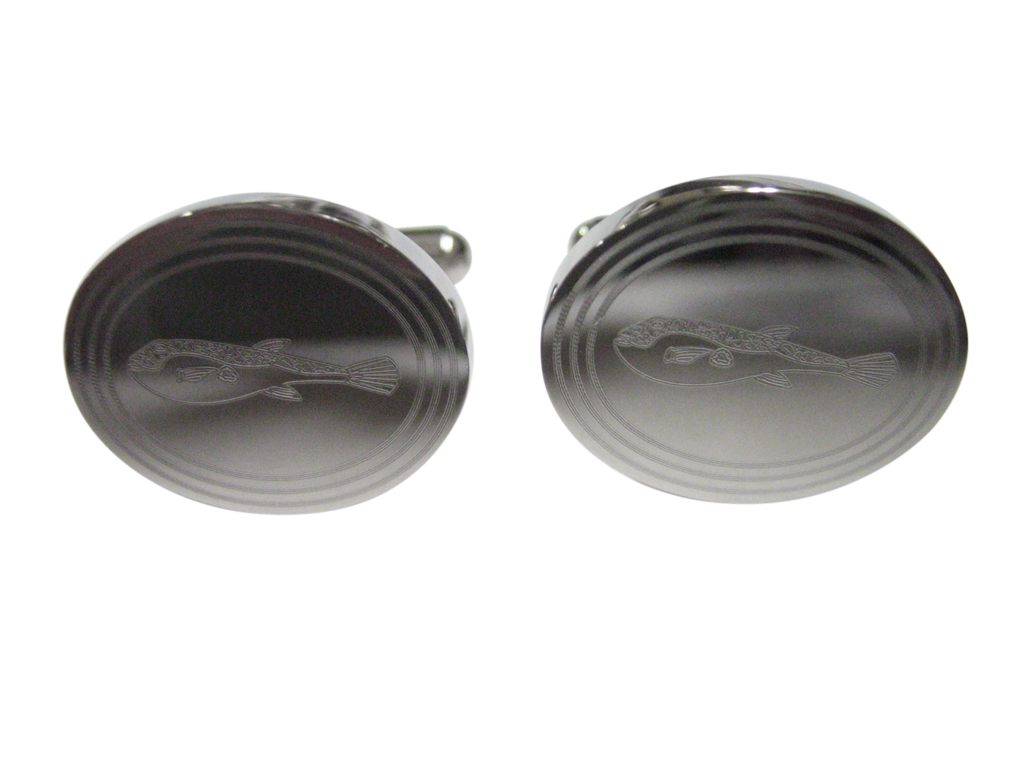 Silver Toned Etched Oval Puffer Fish Cufflinks