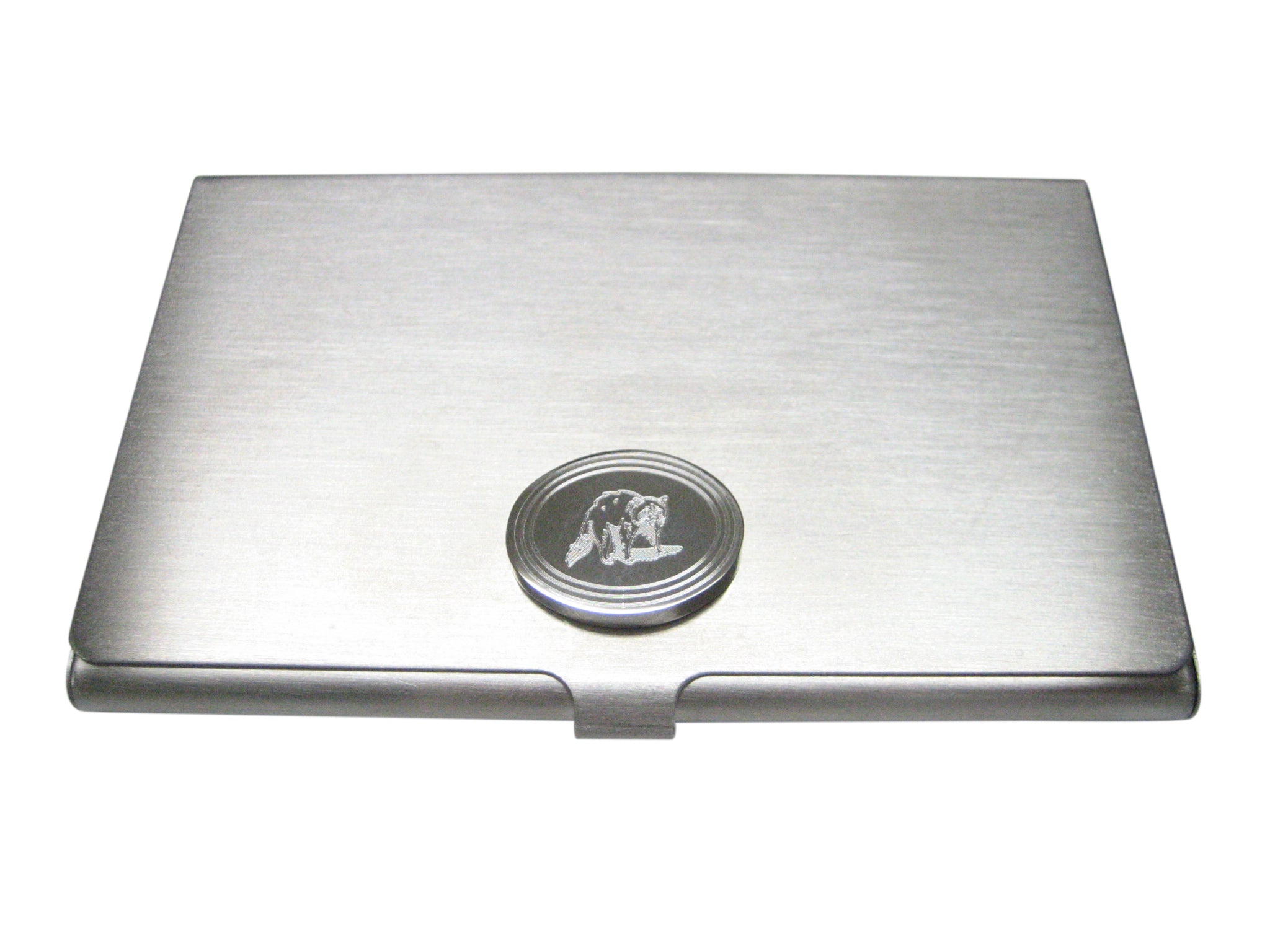 Silver Toned Etched Oval Shaded Raccoon Business Card Holder