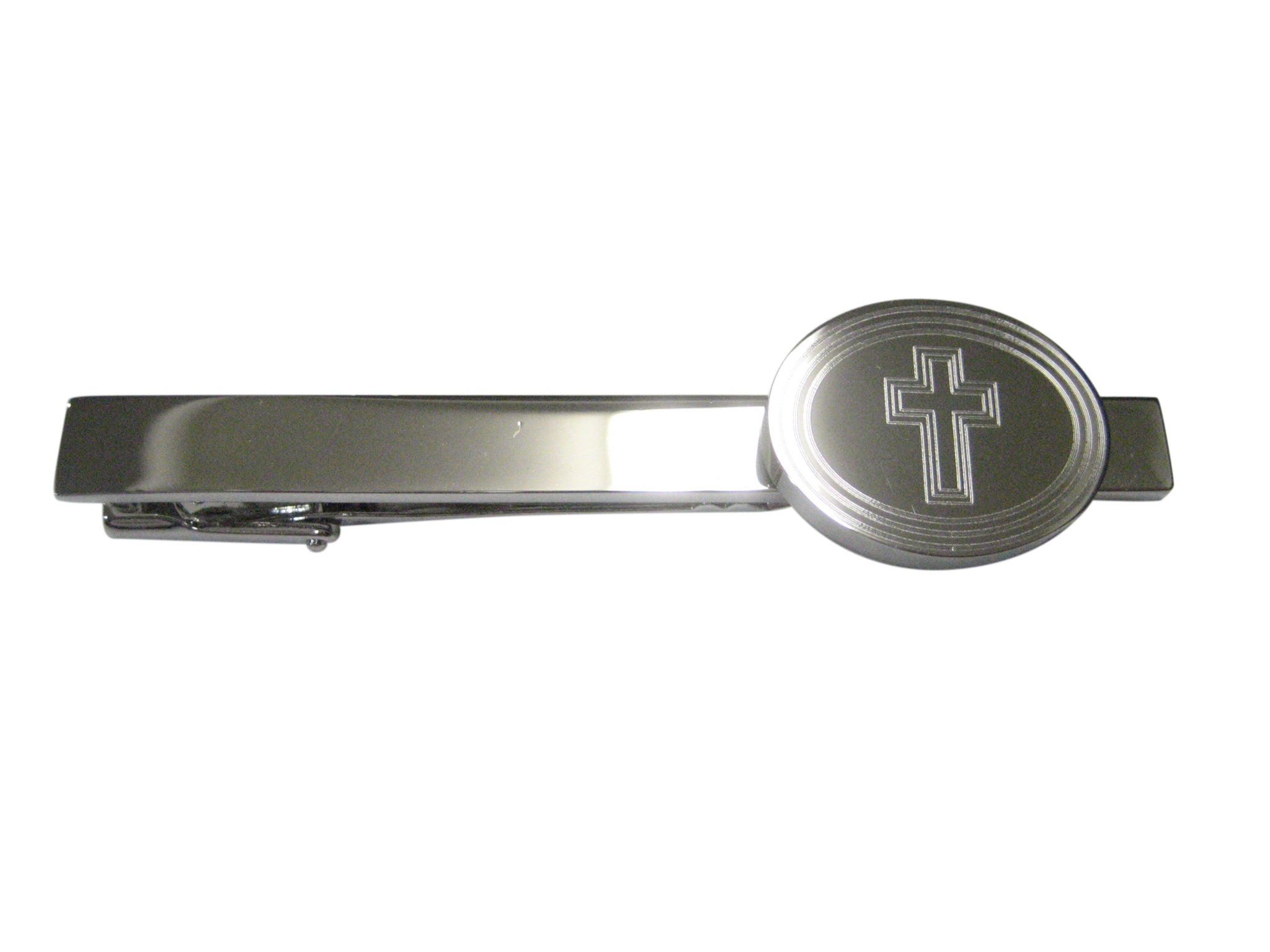 Silver Toned Etched Oval Triple Religious Cross Tie Clip