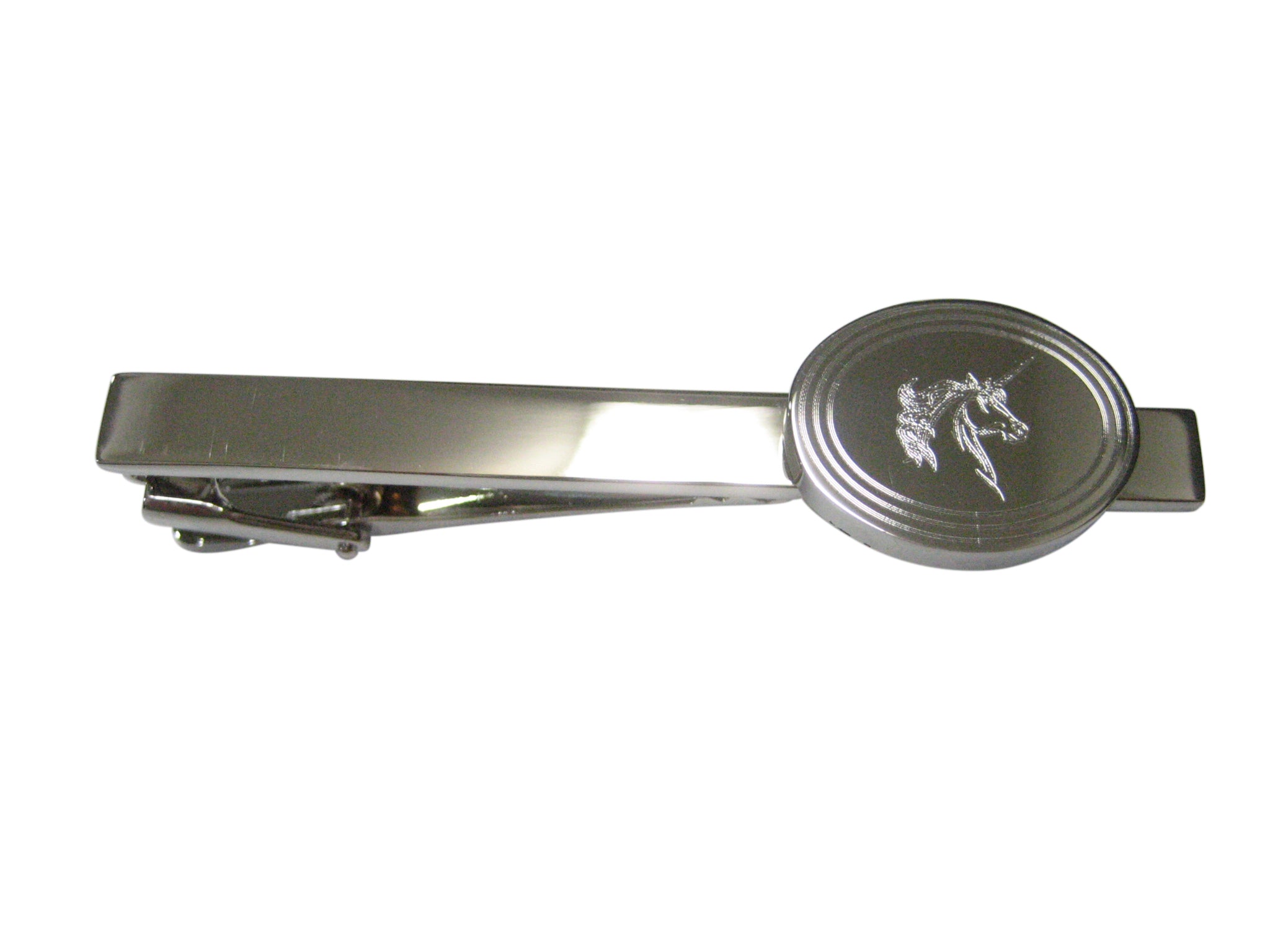 Silver Toned Etched Oval Unicorn Head Tie Clip