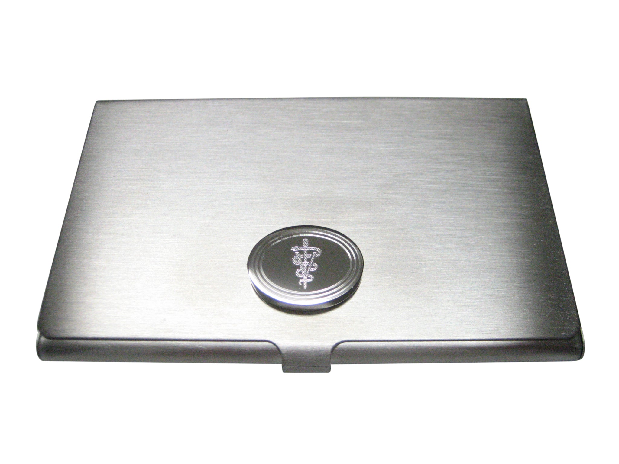 Silver Toned Etched Oval Veterinary Caduceus Symbol Business Card Holder