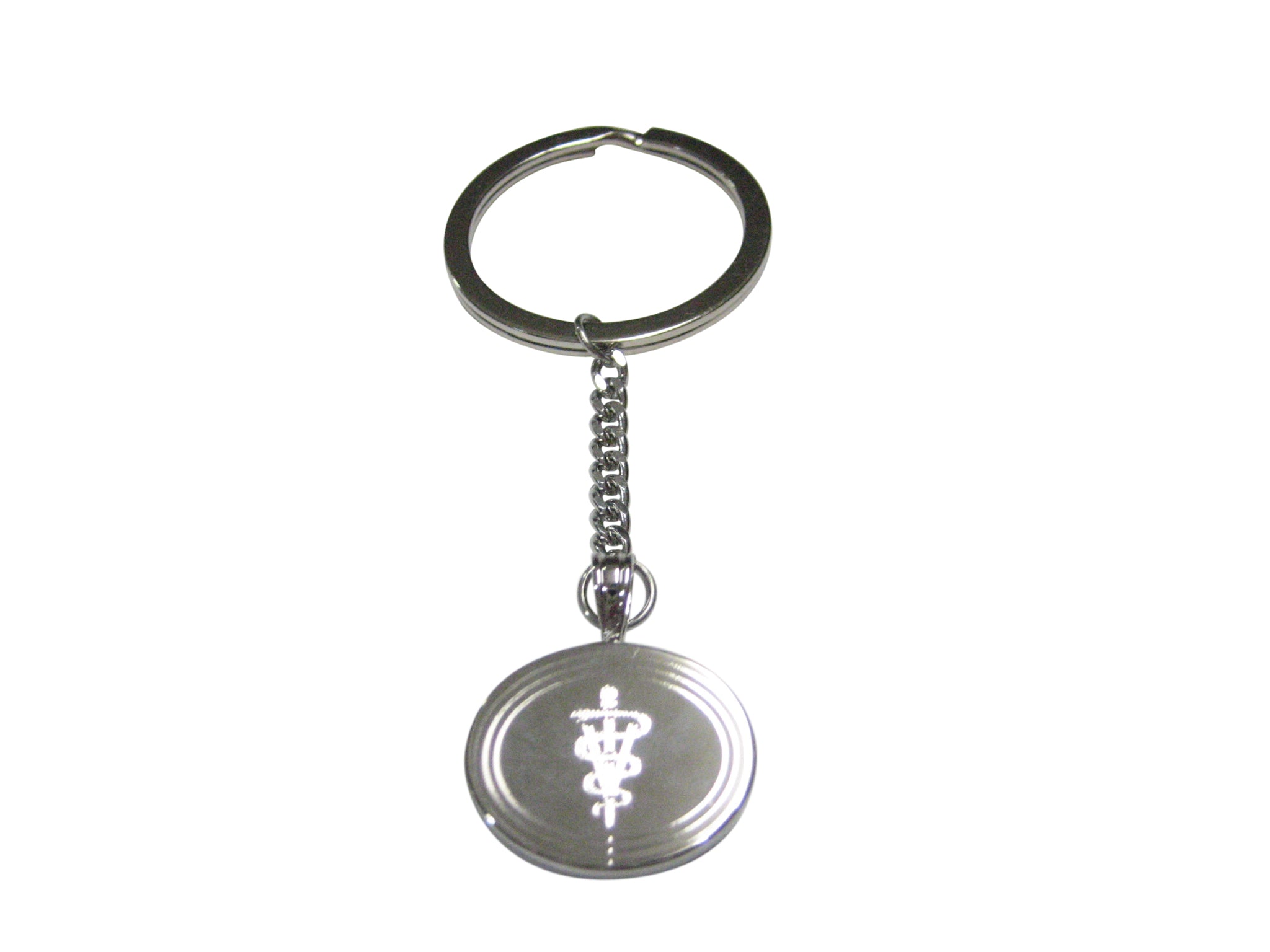 Silver Toned Etched Oval Veterinary Caduceus Symbol Pendant Keychain