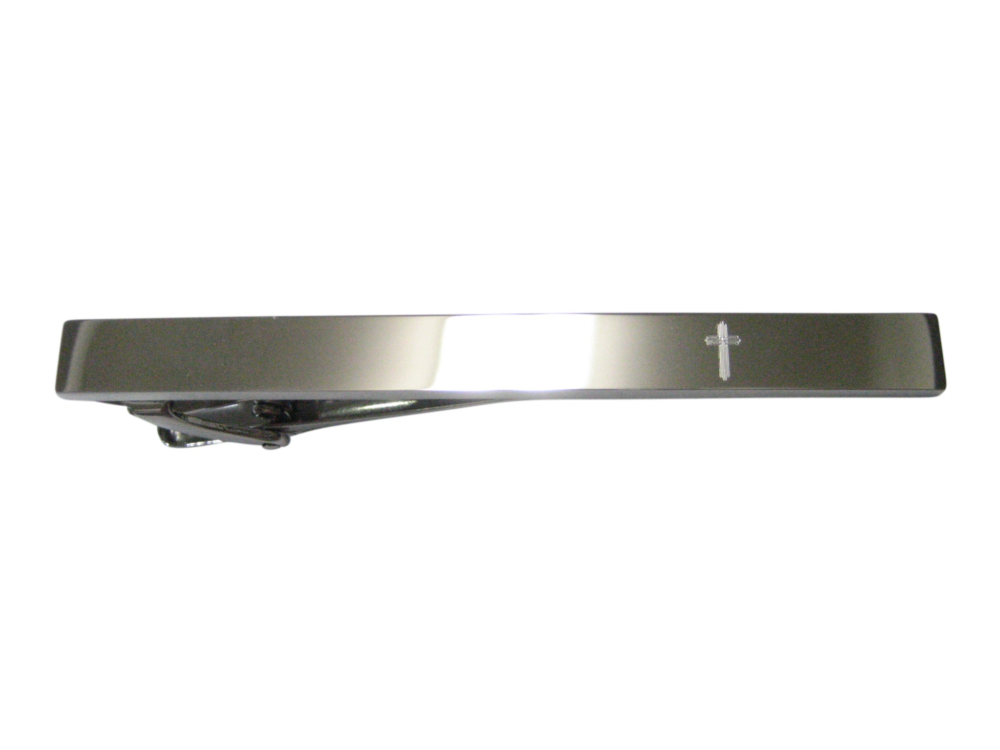 Silver Toned Etched Sleek Lined Religious Cross Tie Clip